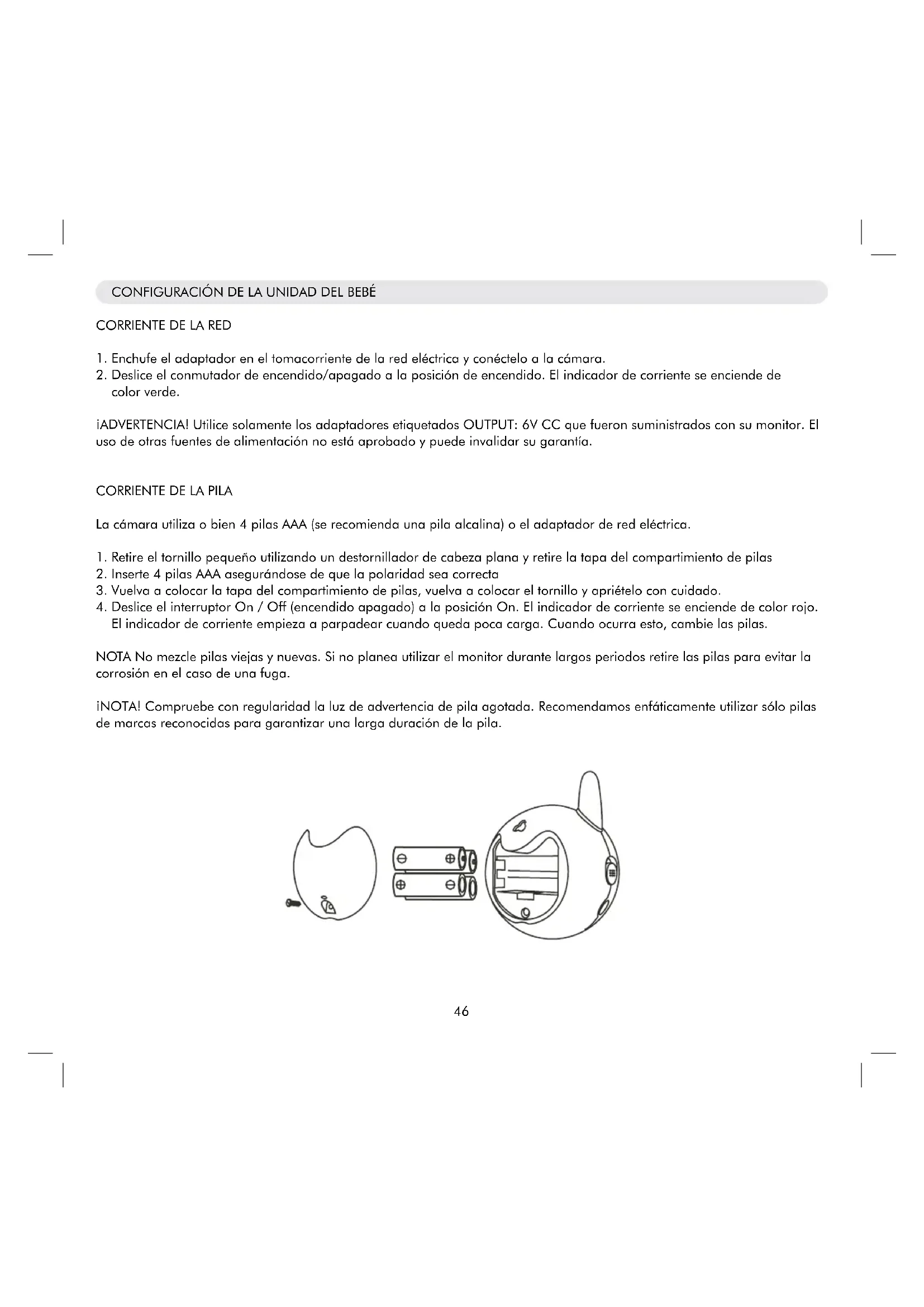 iADVERTENCIA! Ullice solamente los adaptadores etiquetados OUTPUT: 6V CC que fueon suministrados con su monitor. El uso de otheras fuentes de alimentacion no está aprobado y possible invalidar su garantia.