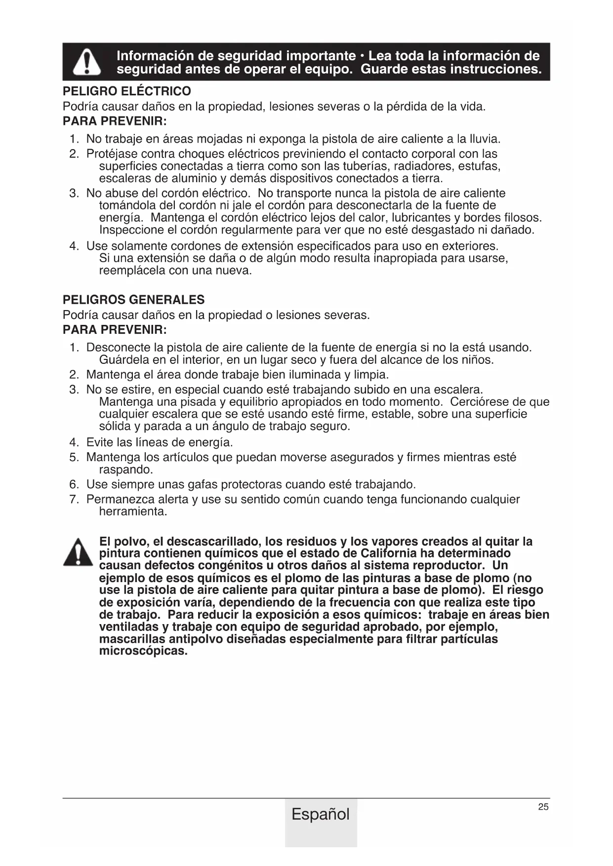 El polvo, el descascarillado, los residuos y los vapeores 创建 al quitar la pintura contienen químicos que el estado de California ha determinado causan defectos congenitos u otherds alsystema reproductor. Un exemple de esos químicos es el plomo de las pinturas a base de plomo (no use la pistola de aire caliente para quitar pintura a base de plomo). El riesgo de exposión varia, dependiendo de la Frequencia con que realiza este tipo de trabajo. Para reducir la exposión a esos químicos: trabajo en Areas bien ventiladas y trabajo con equipo de seguridad aprobado, por example, mascarillas antipolvo disénadas especialmente para filtrar partículas microscóicas.