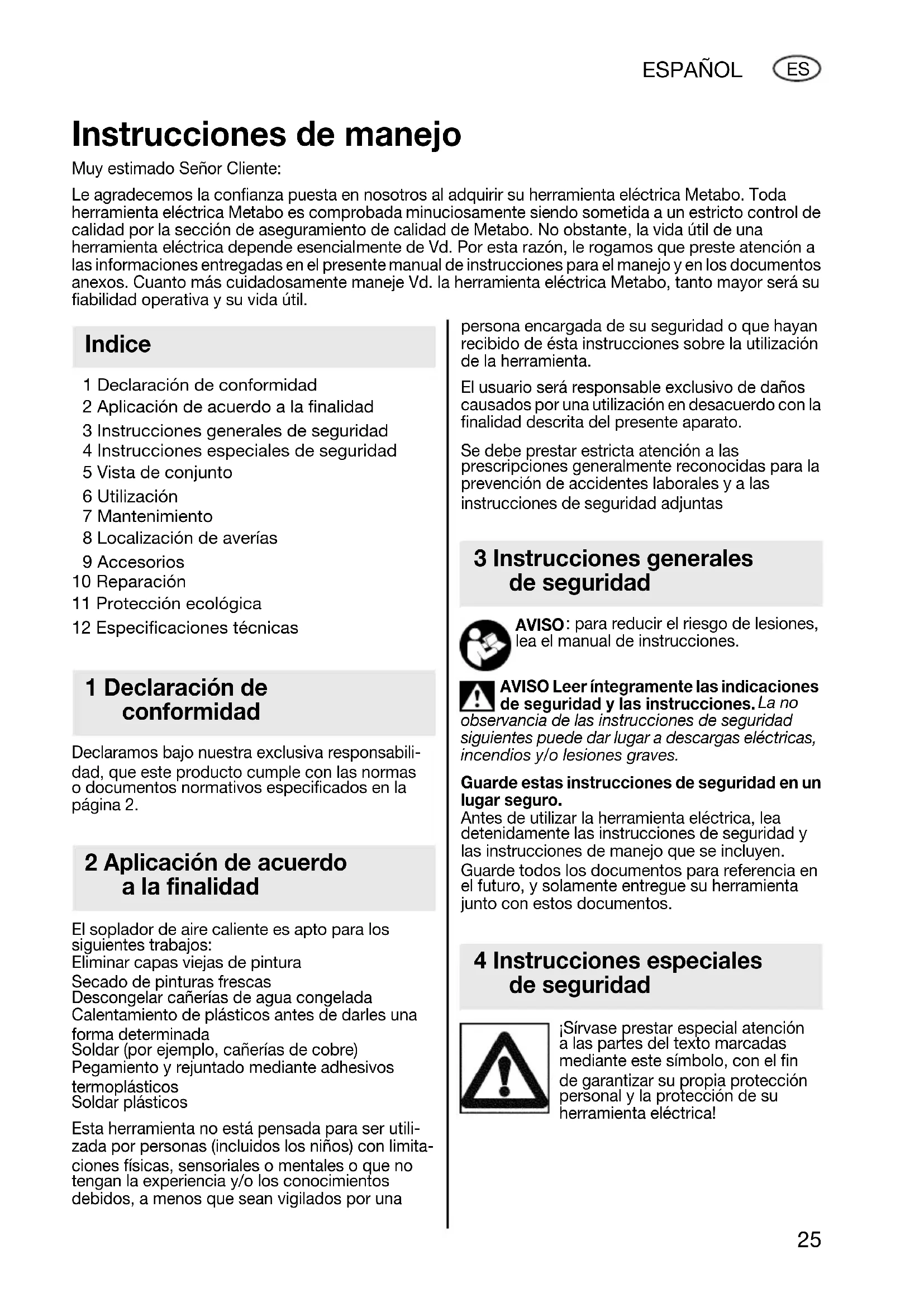 1 Declaración de conformidad 2 Aplicación de acuerdo a la finalidad 3 Instrucciones generales de seguridad 4 Instrucciones especiales de seguridad 5 Vista de conjunto 6 Utilización 7 Mantenimiento 8 Localización de averías 9 Accesorios 10 Reparación 11 Protección ecológica 12 Especificaciones técnicas Declaramos bajo nuestra exclusiva responsabili- dad, que este producto cumple con las normas o documentos normativos especificados en la página 2. El soplador de aire caliente es apto para los siguientes trabajos: Eliminar capas viejas de pintura Secado de pinturas frescas Descongelar cañerías de agua congelada Calentamiento de plásticos antes de darles una forma determinada Soldar (por ejemplo, cañerías de cobre) Pegamiento y rejuntado mediante adhesivos termoplásticos Soldar plásticos Esta herramienta no está pensada para ser utili- zada por personas (incluidos los niños) con limita- ciones físicas, sensoriales o mentales o que no tengan la experiencia y/o los conocimientos debidos, a menos que sean vigilados por una persona encargada de su seguridad o que hayan recibido de ésta instrucciones sobre la utilización de la herramienta. El usuario será responsable exclusivo de daños causados por una utilización en desacuerdo con la finalidad descrita del presente aparato. Se debe prestar estricta atención a las prescripciones generalmente reconocidas para la prevención de accidentes laborales y a las instrucciones de seguridad adjuntas AVISO : para reducir el riesgo de lesiones, lea el manual de instrucciones. AVISO Leer íntegramente las indicaciones de seguridad y las instrucciones. La no observancia de las instrucciones de seguridad siguientes puede dar lugar a descargas eléctricas, incendios y/o lesiones graves. Guarde estas instrucciones de seguridad en un lugar seguro. Antes de utilizar la herramienta eléctrica, lea detenidamente las instrucciones de seguridad y las instrucciones de manejo que se incluyen. Guarde todos los documentos para referencia en el futuro, y solamente entregue su herramienta junto con estos documentos. ¡Sírvase prestar especial atención a las partes del texto marcadas mediante este símbolo, con el fin de garantizar su propia protección personal y la protección de su herramienta eléctrica! Instrucciones de manejo Muy estimado Señor Cliente: Le agradecemos la confianza puesta en nosotros al adquirir su herramienta eléctrica Metabo. Toda herramienta eléctrica Metabo es comprobada minuciosamente siendo sometida a un estricto control de calidad por la sección de aseguramiento de calidad de Metabo. No obstante, la vida útil de una herramienta eléctrica depende esencialmente de Vd. Por esta razón, le rogamos que preste atención a las informaciones entregadas en el presente manual de instrucciones para el manejo y en los documentos anexos. Cuanto más cuidadosamente maneje Vd. la herramienta eléctrica Metabo, tanto mayor será su fiabilidad operativa y su vida útil. Indice 1 Declaración de conformidad 2 Aplicación de acuerdo a la finalidad 3 Instrucciones generales de seguridad 4 Instrucciones especiales de seguridad 17024612_0409 HE 2300 HE 2000 H 1600.book Seite 25 Dienstag, 16. Juni 2009 11:40 1126 ESPAÑOL
