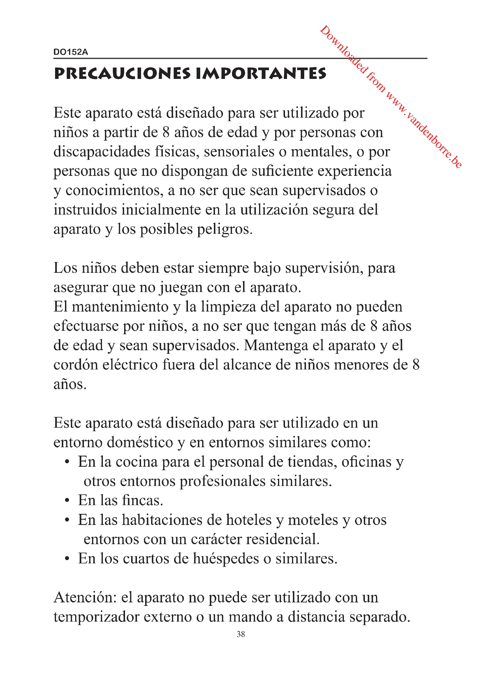 - En los cuartos de huéspedes o similares. Atención: el aparato no puede ser utilizado con un temporizador externo o un mando a distancia separado. Downloaded from www.vandenborre.beDO152A