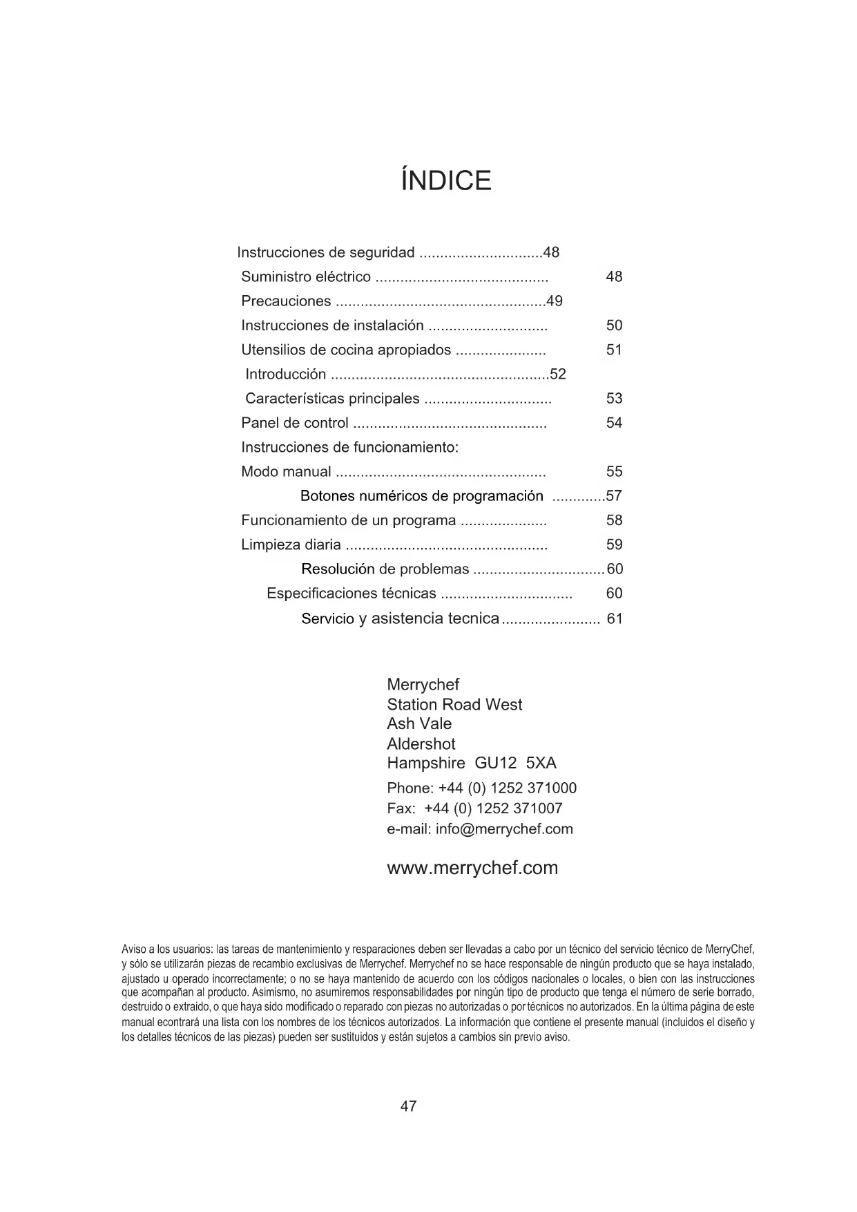 Servicio y asistencia tecnica ........................ 61 Merrychef Station Road West Ash Vale Aldershot Hampshire GU12 5XA Phone: +44 (0) 1252 371000 Fax: +44 (0) 1252 371007 e-mail: info@merrychef.com www.merrychef.com ÍNDICE Aviso a los usuarios: las tareas de mantenimiento y resparaciones deben ser llevadas a cabo por un técnico del servicio técnico de MerryChef, y sólo se utilizarán piezas de recambio exclusivas de Merrychef. Merrychef no se hace responsable de ningún producto que se haya instalado, ajustado u operado incorrectamente; o no se haya mantenido de acuerdo con los códigos nacionales o locales, o bien con las instrucciones que acompañan al producto. Asimismo, no asumiremos responsabilidades por ningún tipo de producto que tenga el número de serie borrado, destruido o extraido, o que haya sido modicado o reparado con piezas no autorizadas o por técnicos no autorizados. En la última página de este manual econtrará una lista con los nombres de los técnicos autorizados. La información que contiene el presente manual (incluidos el diseño y los detalles técnicos de las piezas) pueden ser sustituidos y están sujetos a cambios sin previo aviso.48