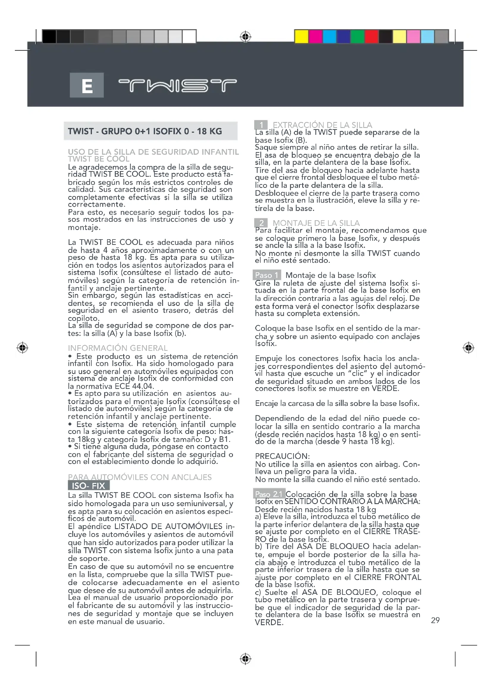 Le agradecemos la compra de la silla de seg-. uridad TWIST BE COOL. Este producto está fabracion segun los mas estrictos controles de calidad. Sus caracteristicas de seguidad son completeness efectivas si la silla se utilizecorrectamente.