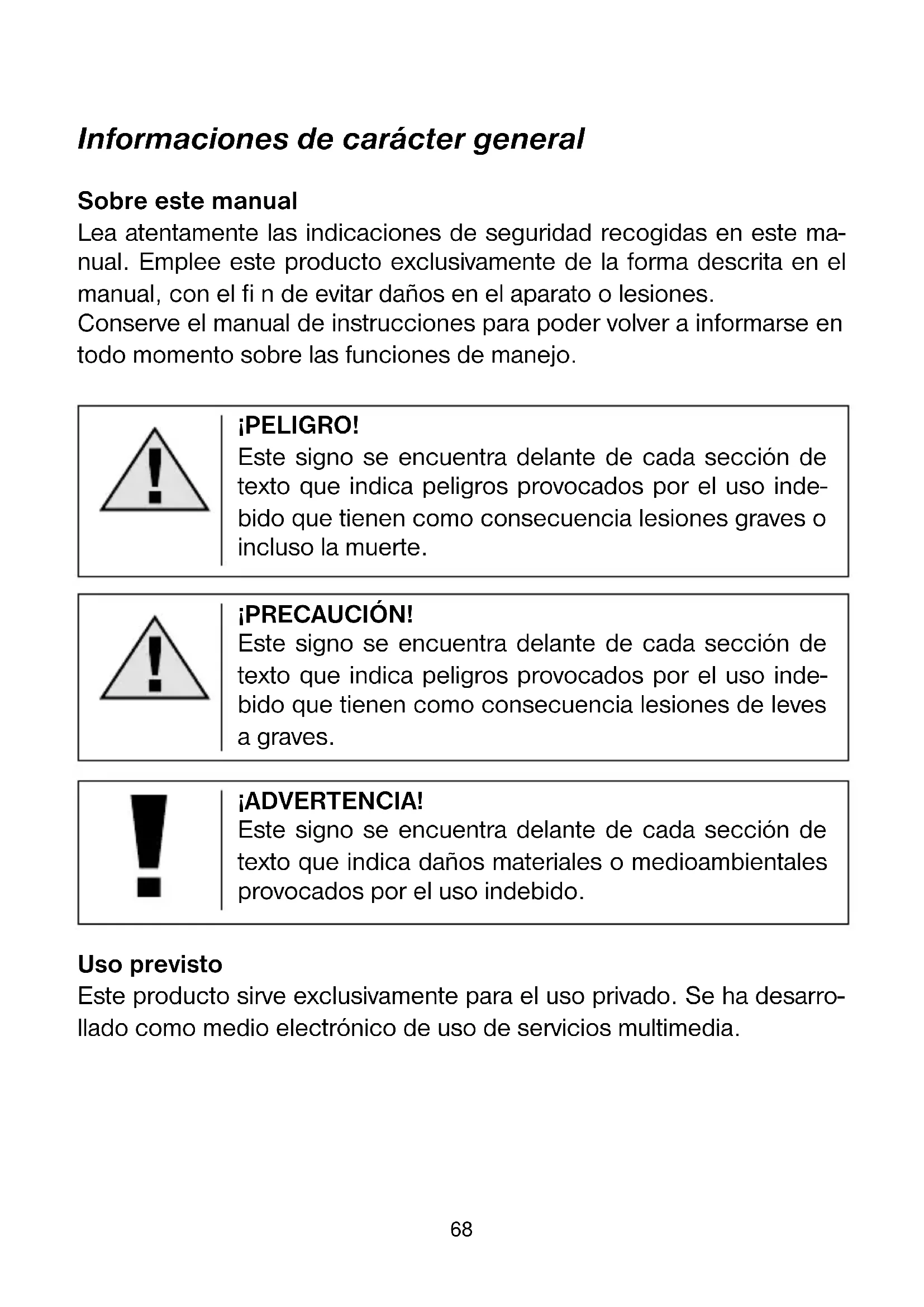 - Considerati i limiti dei mezzi di stampa, la rappresentazi- one del display nel presente manuale può non essere fedele al display reale. Con riserva di modifi che.68 Informaciones de carácter general Sobre este manual Lea atentamente las indicaciones de seguridad recogidas en este ma- nual. Emplee este producto exclusivamente de la forma descrita en el manual, con el fi n de evitar daños en el aparato o lesiones. Conserve el manual de instrucciones para poder volver a informarse en todo momento sobre las funciones de manejo. ¡PELIGRO! Este signo se encuentra delante de cada sección de texto que indica peligros provocados por el uso inde- bido que tienen como consecuencia lesiones graves o incluso la muerte. ¡PRECAUCIÓN! Este signo se encuentra delante de cada sección de texto que indica peligros provocados por el uso inde- bido que tienen como consecuencia lesiones de leves a graves. ¡ADVERTENCIA! Este signo se encuentra delante de cada sección de texto que indica daños materiales o medioambientales provocados por el uso indebido. Uso previsto Este producto sirve exclusivamente para el uso privado. Se ha desarro- llado como medio electrónico de uso de servicios multimedia.ES