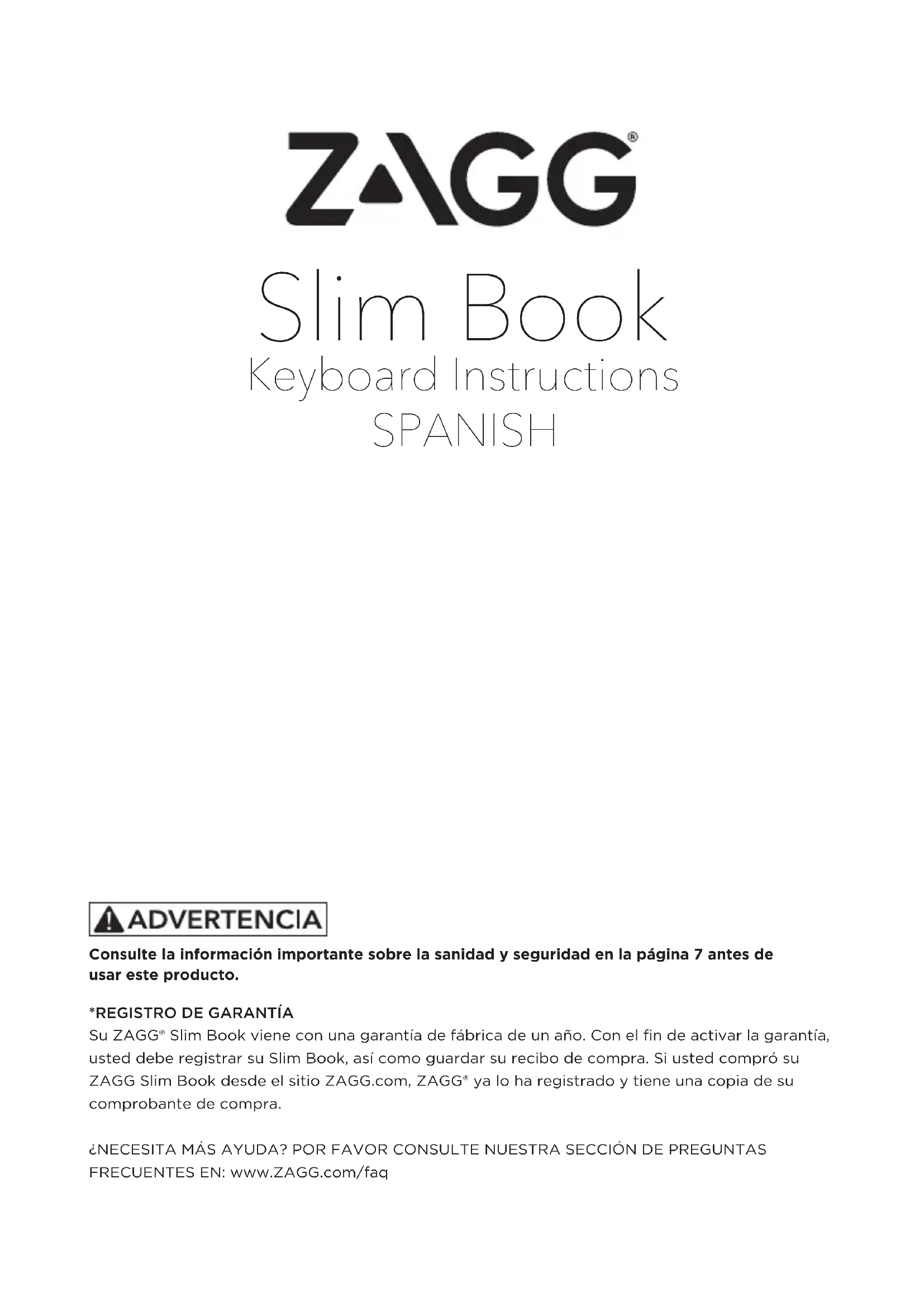 que el indicador LED parpadee mostrando una luz azul. CAPS LOCK - Activa la función de Bloqueo de Mayúsculas. Cuando la función Bloqueo de Mayúsculas está activa se encenderá un indicador de luz azul que permanecerá encendido hasta que se apague. Para desactivar el Bloqueo de Mayúsculas, presione simplemente Bloqueo de Mayúsculas de nuevo. SÍMBOLO DEL MUNDO - Alterna entre los teclados internacionales (cuando se activa en la configuración de su iPad). SÍMBOLO DE LA BATERÍA - Indica duración de la batería restante. FN + SÍMBOLO DE LUZ DE FONDO- Activa la función de luz de fondo de su Slim Book. Al pulsar esta tecla una vez se enciende la luz de fondo, al presionarla de nuevo se apagará la luz de fondo. NOTA: La iluminación de fondo se apagará automáticamente después de un par de segundos si no se utiliza. Comience a escribir de nuevo para activarlos.6 Para más ayuda por favor vea nuestra sección de preguntas frecuentes en: www.zagg.com/faq Para comunicarse con un representante de atención al cliente, por favor utilice los siguientes canales: ZAGG.com/support/contact.php | questions@zagg.com 1-800-700-ZAGG [9244] | 00-1-801-839-3906 para clientes internacionales Para una protección sin precedentes anti rayas para su tableta, recomendamos el ZAGG’s invisibleSHIELD®. ©2005 - 2014 ZAGG Inc Todos los Derechos Reservados. PATENTE PENDIENTE | NASDAQ: ZAGG | HECHO EN CHINA iPad® y Apple® son marcas registradas de Apple, Inc. Bluetooth® es una marca registrada de Bluetooth SIG., Inc. ZAGG®, InvisibleShield®, y ZAGG Slim Book son marcas comerciales o marcas registradas de ZAGG Inc. Cualquier cambio o modificación que no este aprobado expresamente por las partes responsables del cumplimiento de la ley, pueden anular la autoridad que tiene el usuario para operar el equipo. Este dispositivo ha sido probado y cumple con los limites para dispositivos digitales Clase B, en cumplimiento con la parte 15 del reglamento de la FCC. Estos limites son diseñados para proporcionar una protección razonable contra interferencia dañina en instalaciones residenciales. Este equipo genera, utiliza y puede irradiar energía de radio frecuencia y, si no se instala y utiliza de acuerdo con las instrucciones, puede ocasionar interferencia dañina a las comunicaciones radiales. Sin embargo, no existe garantía alguna que la interferencia no ocurrirá en una instalación en particular. Si este dispositivo causa interferencias dañinas a la recepción de radio y televisión, la cual se puede determinar al encender y apagar el dispositivo, se alienta al usuario a corregir la interferencia tomando una o varias de las siguientes medidas: