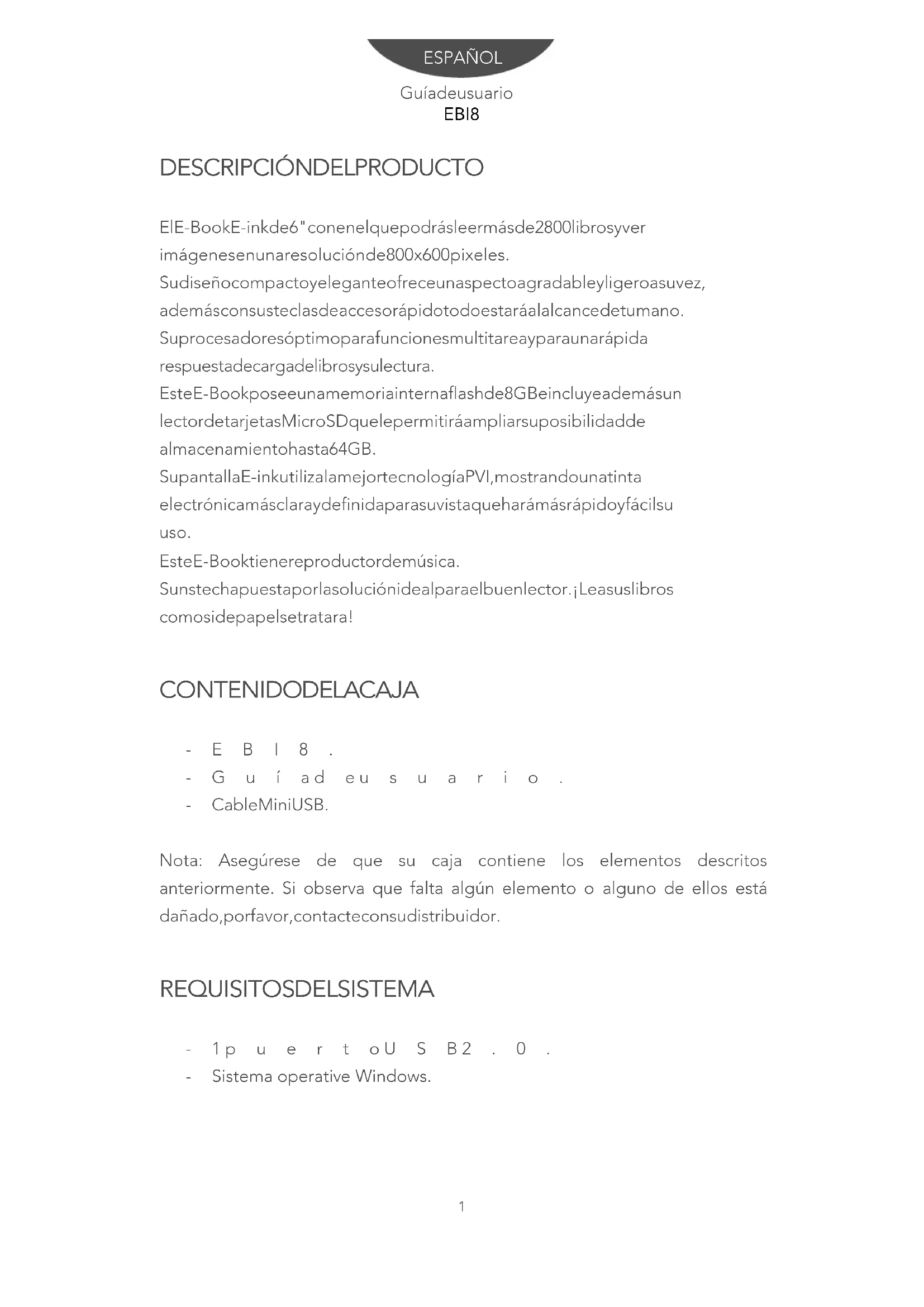 Descarga las instrucciones para tu Lector electrónico en formato PDF gratis! Encuentra tus instrucciones EBI8 - Sunstech y toma tu dispositivo electrónico nuevamente en la mano. En esta página están publicados todos los documentos necesarios para el uso de su dispositivo. EBI8 de la marca Sunstech.