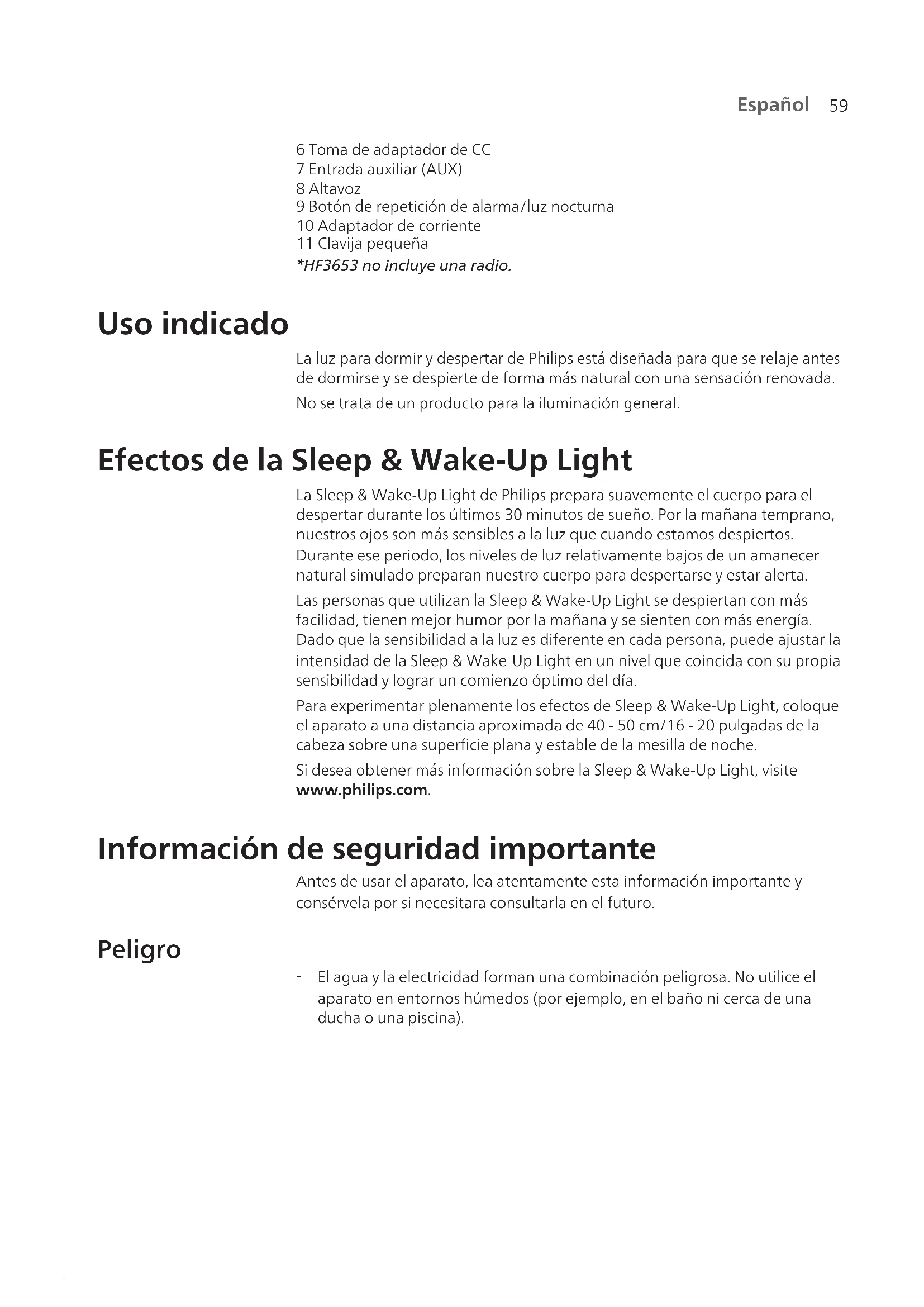 Español Contenido Introducción _____________________________________________________________________________ 58 Descripción general________________________________________________________________________ 58 Uso indicado______________________________________________________________________________ 59 Efectos de la Sleep & Wake-Up Light _________________________________________________________ 59 Información de seguridad importante________________________________________________________ 59 Seguridad y cumplimiento__________________________________________________________________ 61 Campos electromagnéticos (CEM) ___________________________________________________________ 61 Iconos de menú interactivos ________________________________________________________________ 62 Navegación por el menú ___________________________________________________________________ 63 Ajuste de los perfiles de despertar ___________________________________________________________ 63 Función de reserva de hora + alarma _________________________________________________________ 64 Alarma diferida ___________________________________________________________________________ 64 Descarte de la alarma ______________________________________________________________________ 65 Uso de la Sleep & Wake-Up Light como una lámpara de noche __________________________________ 65 Luz nocturna. _____________________________________________________________________________ 65 Ajustes___________________________________________________________________________________ 65 Música ___________________________________________________________________________________ 67 Programas de relajación____________________________________________________________________ 68 Carga del teléfono móvil ___________________________________________________________________ 69 Limpieza y almacenamiento ________________________________________________________________ 70 Reciclaje _________________________________________________________________________________ 70 Garantía y asistencia _______________________________________________________________________ 70 Resolución de problemas___________________________________________________________________ 70 Software de código abierto y de otras marcas _________________________________________________ 72 Especificaciones ___________________________________________________________________________ 73 Introducción Enhorabuena por la adquisición de este producto, y bienvenido a Philips. Para sacar el mayor partido a la asistencia que Philips le ofrece, registre el producto en www.philips.com/welcome. La luz para dormir y despertar de Philips le ayuda a despertarse de forma más agradable. Si la simulación del amanecer está activa, la intensidad de la luz de la lámpara aumentará gradualmente hasta el nivel establecido y el color de la luz cambiará del rojo profundo de la mañana a la brillante luz del día. La luz prepara suavemente el cuerpo para despertarse a la hora establecida. Para que el despertar sea una experiencia aún más agradable, puede utilizar sonidos naturales o la radio FM * para despertarse. *HF3653 no incluye una radio. Descripción general 1 Carcasa de la lámpara 2 Pantalla 3 Puerto de carga USB 4 Botón de reinicio 5 Antena de radio*59 Español 6 Toma de adaptador de CC 7 Entrada auxiliar (AUX) 8 Altavoz 9 Botón de repetición de alarma/luz nocturna 10 Adaptador de corriente 11 Clavija pequeña *HF3653 no incluye una radio. Uso indicado La luz para dormir y despertar de Philips está diseñada para que se relaje antes de dormirse y se despierte de forma más natural con una sensación renovada. No se trata de un producto para la iluminación general. Efectos de la Sleep & Wake-Up Light La Sleep & Wake-Up Light de Philips prepara suavemente el cuerpo para el despertar durante los últimos 30 minutos de sueño. Por la mañana temprano, nuestros ojos son más sensibles a la luz que cuando estamos despiertos. Durante ese periodo, los niveles de luz relativamente bajos de un amanecer natural simulado preparan nuestro cuerpo para despertarse y estar alerta. Las personas que utilizan la Sleep & Wake-Up Light se despiertan con más facilidad, tienen mejor humor por la mañana y se sienten con más energía. Dado que la sensibilidad a la luz es diferente en cada persona, puede ajustar la intensidad de la Sleep & Wake-Up Light en un nivel que coincida con su propia sensibilidad y lograr un comienzo óptimo del día. Para experimentar plenamente los efectos de Sleep & Wake-Up Light, coloque el aparato a una distancia aproximada de 40-50cm/16-20pulgadas de la cabeza sobre una superficie plana y estable de la mesilla de noche. Si desea obtener más información sobre la Sleep & Wake-Up Light, visite www.philips.com. Información de seguridad importante Antes de usar el aparato, lea atentamente esta información importante y consérvela por si necesitara consultarla en el futuro. Peligro