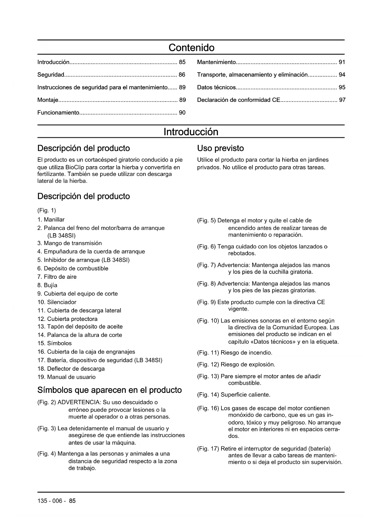 - Declaración de conformidad CE Introducción Descripción del producto El producto es un cortacésped giratorio conducido a pie que utiliza BioClip para cortar la hierba y convertirla en fertilizante. También se puede utilizar con descarga lateral de la hierba. Uso previsto Utilice el producto para cortar la hierba en jardines privados. No utilice el producto para otras tareas. Descripción del producto (Fig. 1) p. 97