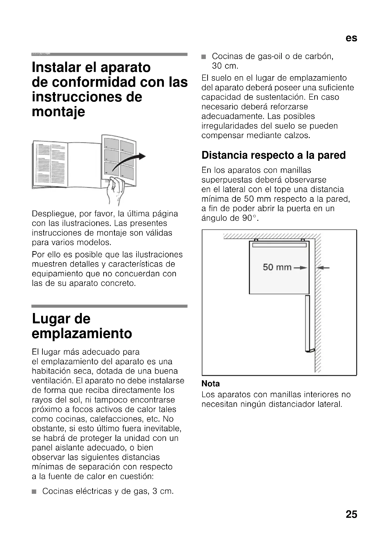 esÍndiceesInstrucciones de montajeAparato de libre instalación Instalar el aparato de conformidad con las instrucciones de montaje Despliegue, por favor, la última página con las ilustraciones. Las presentes instrucciones de montaje son válidas para varios modelos. Por ello es posible que las ilustraciones muestren detalles y características de equipamiento que no concuerdan con las de su aparato concreto. Lugar de emplazamiento El lugar más adecuado para el emplazamiento del aparato es una habitación seca, dotada de una buena ventilación. El aparato no debe instalarse de forma que reciba directamente los rayos del sol, ni tampoco encontrarse próximo a focos activos de calor tales como cocinas, calefacciones, etc. No obstante, si esto último fuera inevitable, se habrá de proteger la unidad con un panel aislante adecuado, o bien observar las siguientes distancias mínimas de separación con respecto a la fuente de calor en cuestión: ■ Cocinas eléctricas y de gas, 3 cm. ■ Cocinas de gas-oil o de carbón, 30 cm. El suelo en el lugar de emplazamiento del aparato deberá poseer una suficiente capacidad de sustentación. En caso necesario deberá reforzarse adecuadamente. Las posibles irregularidades del suelo se pueden compensar mediante calzos. Distancia respecto a la pared En los aparatos con manillas superpuestas deberá observarse en el lateral con el tope una distancia mínima de 50 mm respecto a la pared, a fin de poder abrir la puerta en un ángulo de 90°. Nota Los aparatos con manillas interiores no necesitan ningún distanciador lateral.es
