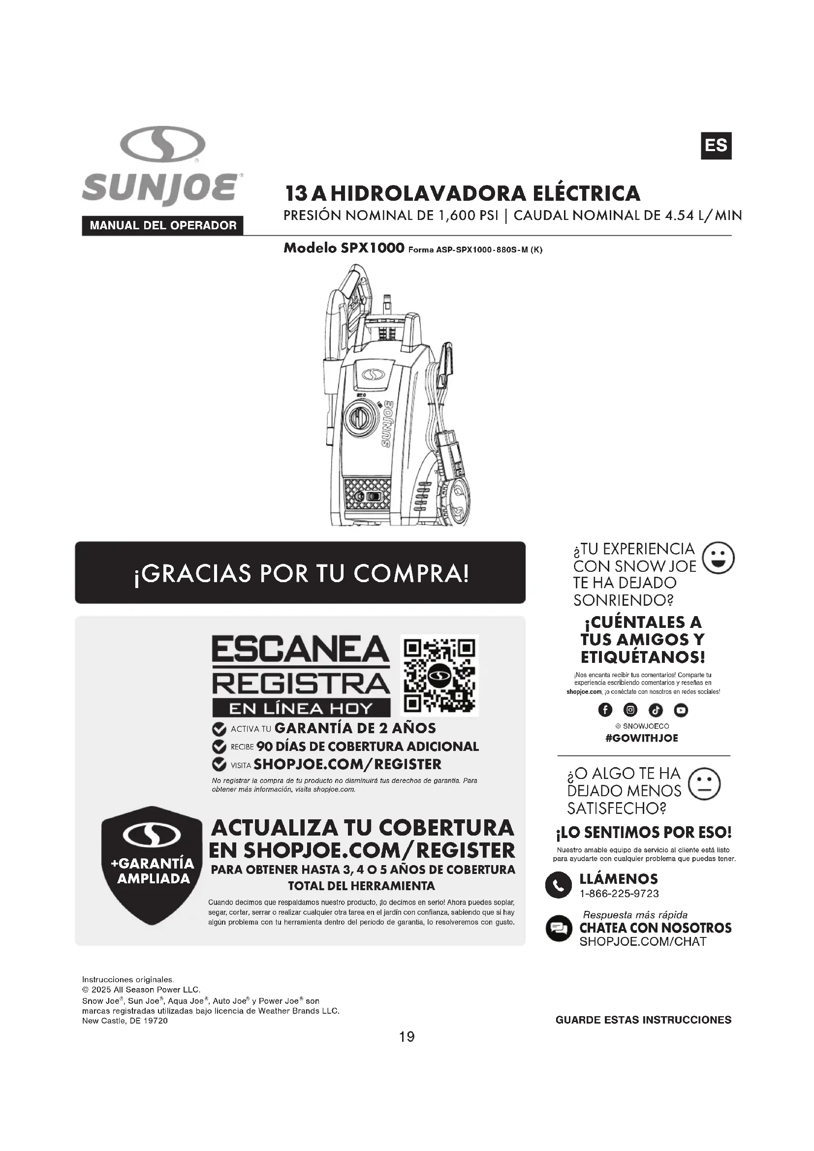 Sun Joe’s complete line of premium pressure washer accessories and attachments make it easy to get your dirty work done, and also help you get the most out of your model! SHOP ONLINE now at shopjoe.com34 R7_06022025 NUESTRA PROMESA AL CLIENTE + GARANTÍA LIMITADA NUESTRA GARANTÍA: All Season Power garantiza que los Productos nuevos, genuinos, con y sin motor, están libres de defectos en materiales o mano de obra cuando se utilizan para uso doméstico ordinario por un período de dos años a partir de la fecha de compra o entrega por el comprador original, usuario final, cuando se compran a All Season Power o a uno de los vendedores autorizados de All Season Power con prueba de compra. Debido a que All Season Power no puede controlar la calidad de sus Productos vendidos por vendedores no autorizados, a menos que la ley prohíba lo contrario, esta Garantía no cubre los Productos comprados a vendedores no autorizados. Si tienes alguna pregunta sobre cómo comprar a un vendedor autorizado, chatea con nosotros en shopjoe.com/support o llámanos al 1-866-225-9723. Si su Producto no funciona o hay un problema con una pieza específica que está cubierta por los términos de esta Garantía, All Season Power elegirá entre (1) enviarle una pieza de repuesto gratuita, (2) sustituir el Producto por un producto nuevo o comparable (que puede incluir un producto reacondicionado, como nuevo) sin coste alguno, o (3) reparar el Producto. ¡Qué guay! REGISTRO DEL PRODUCTO: All Season Power le recomienda encarecidamente que registre su producto. Puedes registrarte online en shopjoe.com/register, chateando con nosotros en shopjoe.com/support o llamando a nuestro Departamento de Atención al Cliente al 1-866-225-9723. El hecho de no registrar su Producto no disminuirá sus derechos de garantía. Sin embargo, el registro de su Producto permitirá a All Season Power servirle mejor con cualquiera de sus necesidades de servicio al cliente. QUIÉN PUEDE SOLICITAR LA COBERTURA DE LA GARANTÍA LIMITADA: Esta Garantía es extendida por All Season Power al comprador original y propietario original del Producto. ¿QUÉ NO ESTÁ CUBIERTO? Esta Garantía no se aplica si el Producto se ha utilizado con fines comerciales o para aplicaciones no domésticas o de alquiler. Esta Garantía tampoco se aplica si el Producto ha sido adquirido a un vendedor no autorizado. Esta Garantía tampoco cubre cambios cosméticos que no afecten al rendimiento. Las piezas de desgaste como correas, sinfines, cadenas y púas no están cubiertas por esta Garantía, y pueden adquirirse en shopjoe.com o llamando al 1-866-225-9723. Le recomendamos que utilice piezas de repuesto y accesorios CERTIFICADOS AUTÉNTICOS Snow Joe