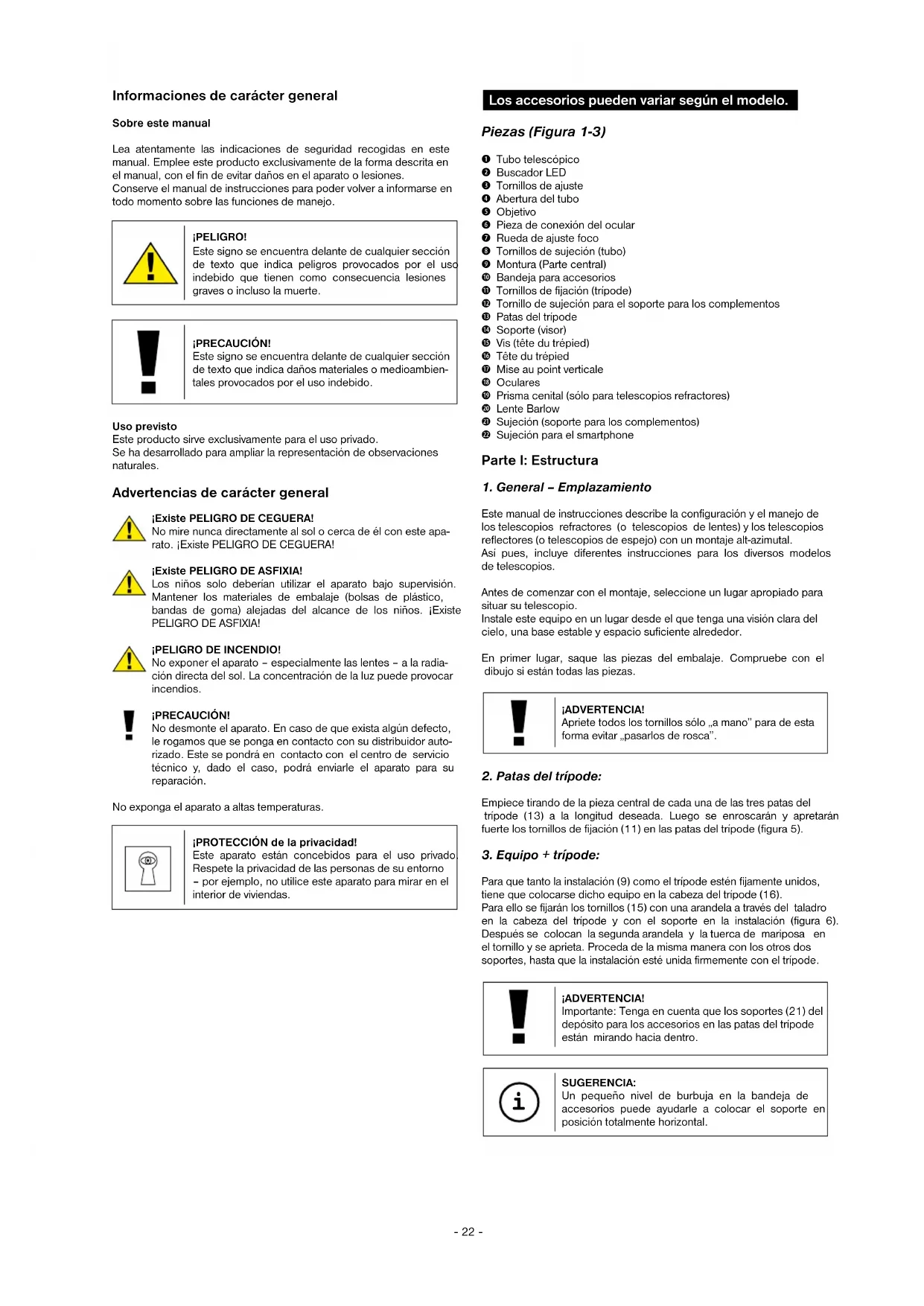 Este manual de instrucciones describe la configuración y el manejo de los telescopios refractores (o telescopios de lentes) y los telescopios reflectores (o telescopios de espejo) con un montaje alt-azimutal. Así pues, incluye diferentes instrucciones para los diversos modelos de telescopios. Antes de comenzar con el montaje, seleccione un lugar apropiado para situar su telescopio. Instale este equipo en un lugar desde el que tenga una visión clara del cielo, una base estable y espacio suficiente alrededor. En primer lugar, saque las piezas del embalaje. Compruebe con el dibujo si están todas las piezas. ¡ADVERTENCIA! Apriete todos los tornillos sólo „a mano” para de esta forma evitar „pasarlos de rosca”.