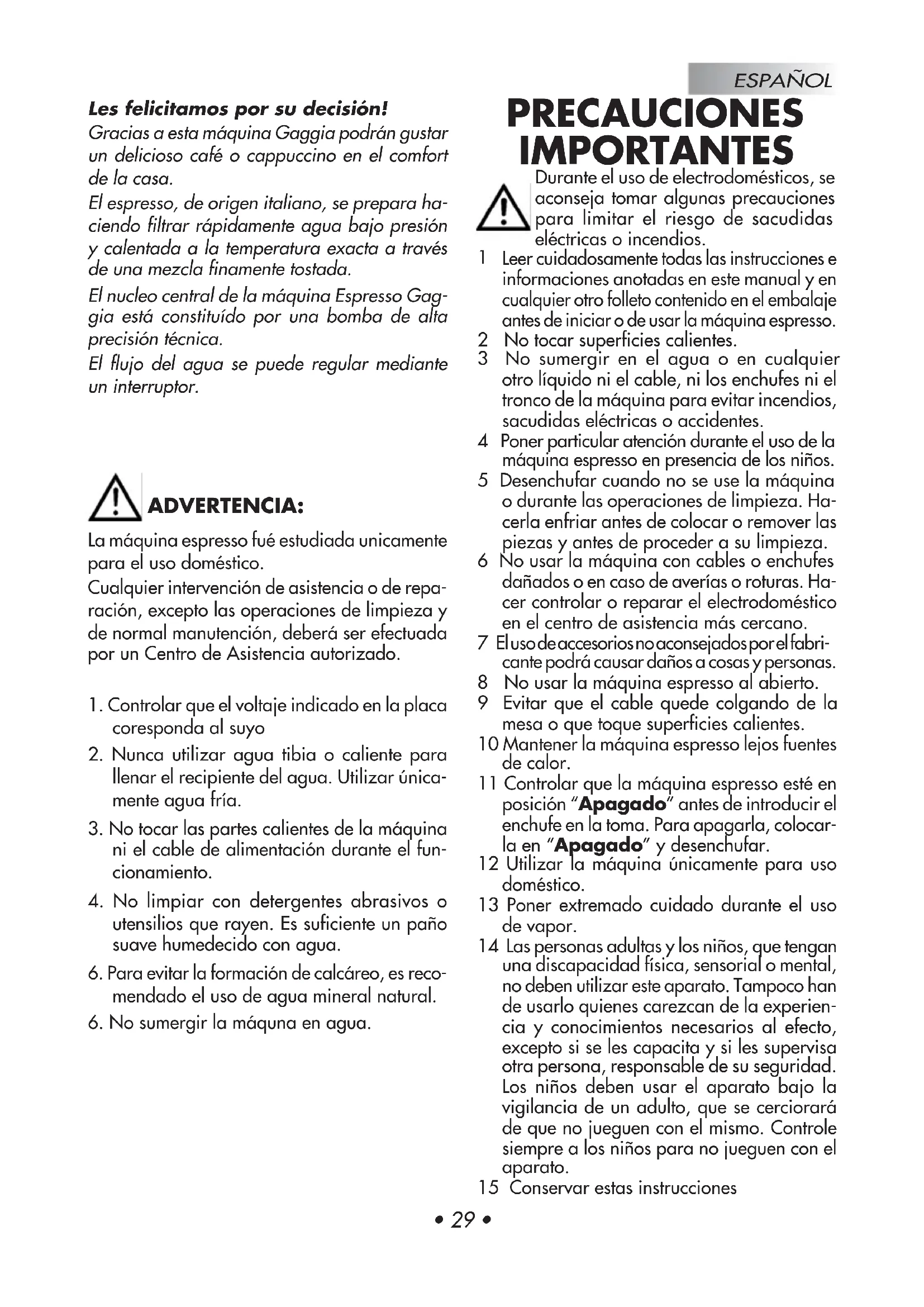 Leer cuidadosamente todas las instrucciones e informaciones anotadas en este manual y en cualquier otro folleto contenido en el embalaje antes de iniciar o de usar la máquina espresso. 2 No tocar superficies calientes. 3 No sumergir en el agua o en cualquier otro líquido ni el cable, ni los enchufes ni el tronco de la máquina para evitar incendios, sacudidas eléctricas o accidentes. 4 Poner particular atención durante el uso de la máquina espresso en presencia de los niños. 5 Desenchufar cuando no se use la máquina o durante las operaciones de limpieza. Ha- cerla enfriar antes de colocar o remover las piezas y antes de proceder a su limpieza. 6 No usar la máquina con cables o enchufes dañados o en caso de averías o roturas. Ha- cer controlar o reparar el electrodoméstico en el centro de asistencia más cercano. 7 El uso de accesorios no aconsejados por el fabri- cante podrá causar daños a cosas y personas. 8 No usar la máquina espresso al abierto. 9 Evitar que el cable quede colgando de la mesa o que toque superficies calientes. 10 Mantener la máquina espresso lejos fuentes de calor. 11 Controlar que la máquina espresso esté en posición “Apagado” antes de introducir el enchufe en la toma. Para apagarla, colocar- la en “Apagado” y desenchufar. 12 Utilizar la máquina únicamente para uso doméstico. 13 Poner extremado cuidado durante el uso de vapor. 14 Las personas adultas y los niños, que tengan una discapacidad física, sensorial o mental, no deben utilizar este aparato. Tampoco han de usarlo quienes carezcan de la experien- cia y conocimientos necesarios al efecto, excepto si se les capacita y si les supervisa otra persona, responsable de su seguridad. Los niños deben usar el aparato bajo la vigilancia de un adulto, que se cerciorará de que no jueguen con el mismo. Controle siempre a los niños para no jueguen con el aparato. 15 Conservar estas instruccionesESPAÑOL