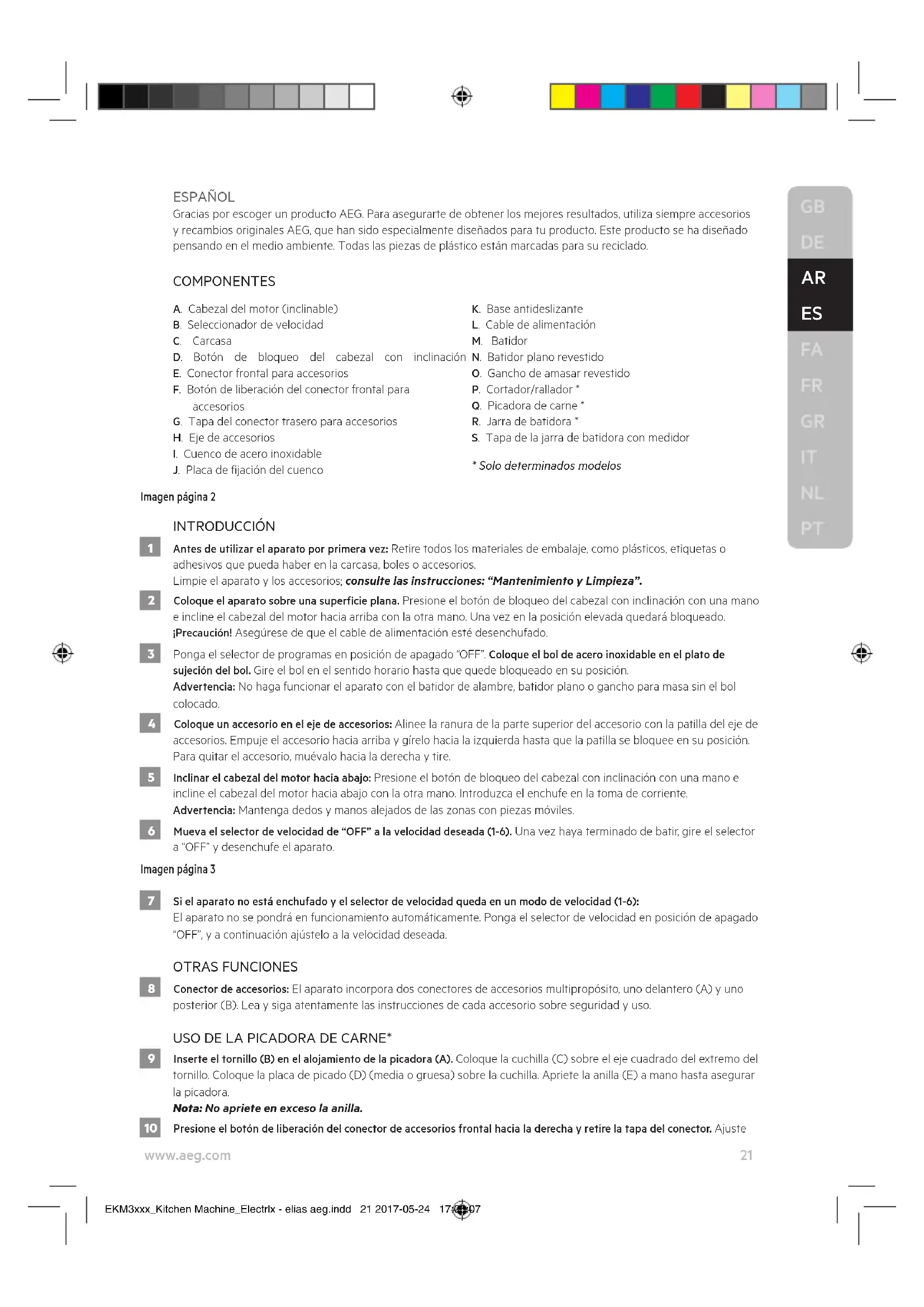 9 Inserte el tornillo (B) en el alojamiento de la picadora (A). Coloque la cuchilla (C) sobre el eje cuadrado del extremo del tornillo. Coloque la placa de picado (D) (media o gruesa) sobre la cuchilla. Apriete la anilla (E) a mano hasta asegurar la picadora. Nota: No apriete en exceso la anilla. 10 Presione el botón de liberación del conector de accesorios frontal hacia la derecha y retire la tapa del conector. Ajuste EKM3xxx_Kitchen Machine_Electrlx - elias aeg.indd 21 2017-05-24 17:06:0722 www.aeg.com el eje motor del accesorio en el conector frontal para accesorios utilizando el botón de liberación del conector de accesorios. El botón de liberación de accesorios hará un clic al quedar en su posición cuando la picadora de carne queda correctamente enganchada. Coloque un recipiente bajo el accesorio. Precaución: Antes de conectar accesorios, apague y desenchufe el aparato. 11 Coloque la bandeja sobre el alojamiento de la picadora. Corte la carne cruda en trozos pequeños y colóquela en la bandeja Enchufe el aparato y gire el selector de velocidad hasta 3-4. Alimente la carne en la tolva con el empujador. Precaución: No introduzca los dedos ni otros utensilios en la tolva de alimentación. Nota: La carne no debe contener huesos y piel.