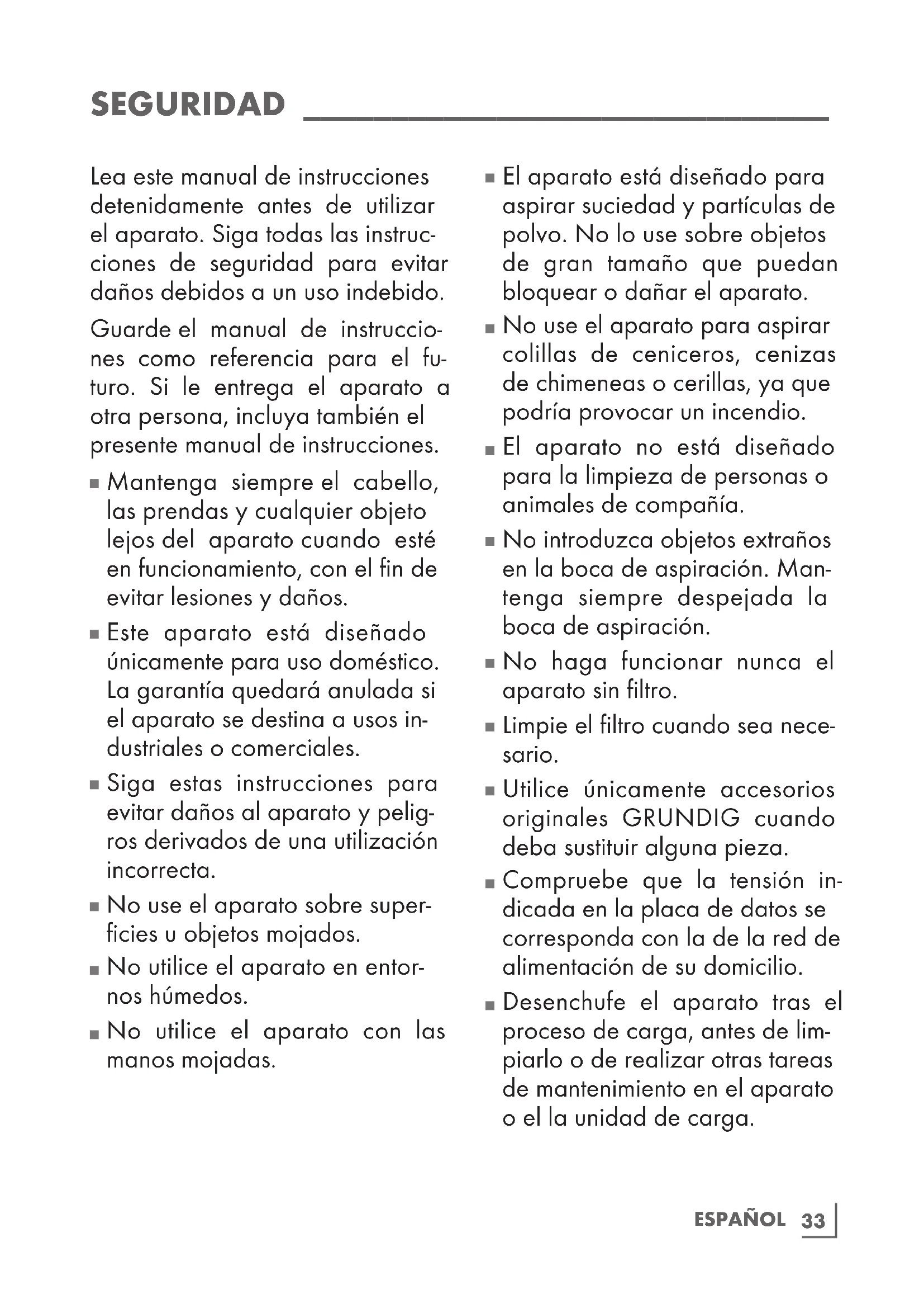 Nuestros electrodomésticos GRUNDIG cumplen con todas las normas de seguridad pertinentes; por esta razón, si el aparato o el cable de alimentación presentan daños, y para evitar cualquier peligro, deberá ser reparado o sustituido por el distribuidor, un servicio técnico o una persona cualificada y autorizada. Los tra- bajos de reparación defectuosos o realizados por personal no cu- alificado puede causar peligros y riesgos para el usuario.