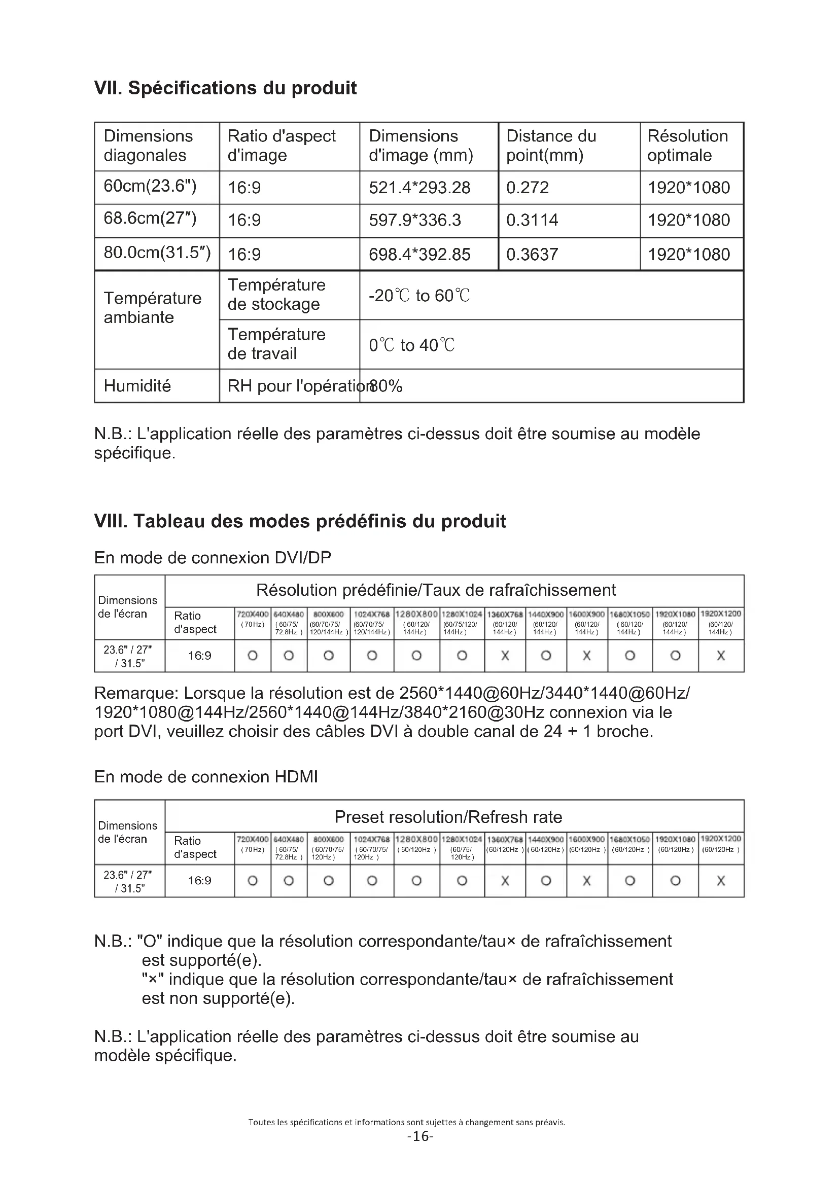 Display dimensions Aspect ratio Resolución de preselección/velocidad de actualización 23.6" / 27" / 31.5"23.6" / 27" / 31.5" En modo de conexión de HDMI 16:9