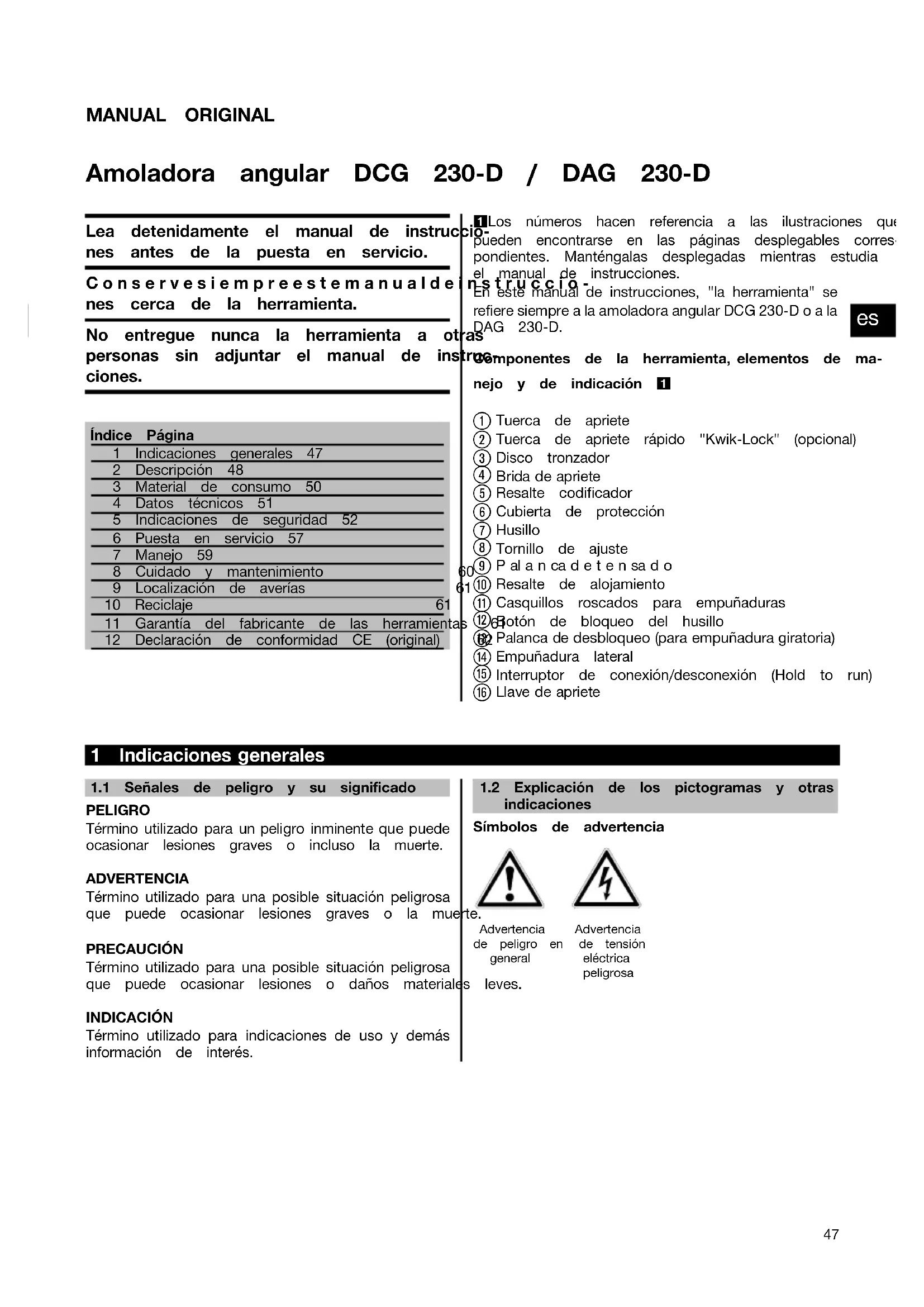 Printed: 20.11.2013 | Doc-Nr: PUB / 5069494 / 000 / 02MANUAL ORIGINAL Amoladora angular DCG 230‑D / DAG 230‑D Lea detenidamente el manual de instruccio- nes antes de la puesta en servicio. Conservesiempreestemanualdeinstruccio- nes cerca de la herramienta. No entregue nunca la herramienta a otras personas sin adjuntar el manual de instruc- ciones. Índice Página1 Indicaciones generales 472 Descripción 483 Material de consumo 504 Datos técnicos 515 Indicaciones de seguridad 526 Puesta en servicio 577 Manejo 598 Cuidado y mantenimiento 609 Localización de averías 6110 Reciclaje 6111 Garantía del fabricante de las herramientas 6112 Declaración de conformidad CE (original) 621 Los números hacen referencia a las ilustraciones quepueden encontrarse en las páginas desplegables corres-pondientes. Manténgalas desplegadas mientras estudiael manual de instrucciones. En este manual de instrucciones, "la herramienta" se refieresiemprealaamoladoraangularDCG230‑Doala DAG 230‑D.Componentes de la herramienta, elementos de ma-nejo y de indicación 1 Tuerca de apriete Tuerca de apriete rápido "Kwik-Lock" (opcional) Disco tronzador