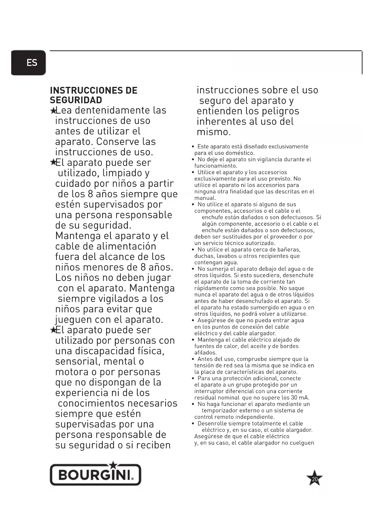 El periodo de garantía tendrá una duración de 2 años a partir de la Fecha de compra según el comprobante de caja, que sera asimismo el certificado de garantía. Dirijase al vendedor en relacion con la garantía. Los defectos derivados de un uso indefinido, de un desmontaje inadequado, de cañas, golpes o similar o por no descalcificar a tiempo los aparatos que seutilicen con agua no estarán cubiertos por la garantía. En caso de que para un determinado producto se mentionen conditiones de garantía espécicas, estas conditiones espécicas prevalcerán sobre las conditiones generales. La garantía no sera de aplicación a días consecuencias. Si Tiene preguntas relacionadas con el uso del aparato, le rogamos consulte nuestra páginaweb: www.bourgini.com