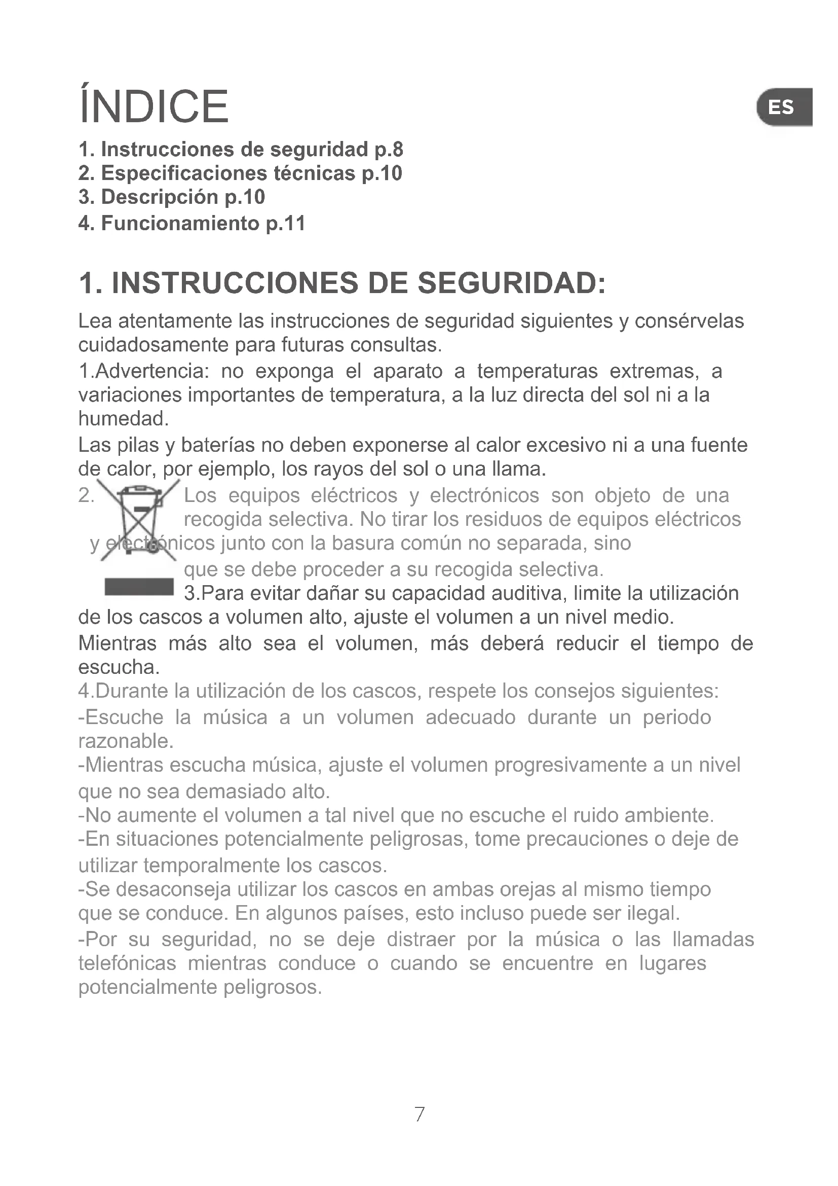 Los equipos eléctricos y electrónicos son objeto de una recogida selectiva. No tirar los residuos de equipos eléctricos y electrónicos junto con la basura común no separada, sino que se debe proceder a su recogida selectiva. 3.Para evitar dañar su capacidad auditiva, limite la utilización de los cascos a volumen alto, ajuste el volumen a un nivel medio. Mientras más alto sea el volumen, más deberá reducir el tiempo de escucha. 4.Durante la utilización de los cascos, respete los consejos siguientes: -Escuche la música a un volumen adecuado durante un periodo razonable. -Mientras escucha música, ajuste el volumen progresivamente a un nivel que no sea demasiado alto. -No aumente el volumen a tal nivel que no escuche el ruido ambiente. -En situaciones potencialmente peligrosas, tome precauciones o deje de utilizar temporalmente los cascos. -Se desaconseja utilizar los cascos en ambas orejas al mismo tiempo que se conduce. En algunos países, esto incluso puede ser ilegal. -Por su seguridad, no se deje distraer por la música o las llamadas telefónicas mientras conduce o cuando se encuentre en lugares potencialmente peligrosos. ESES