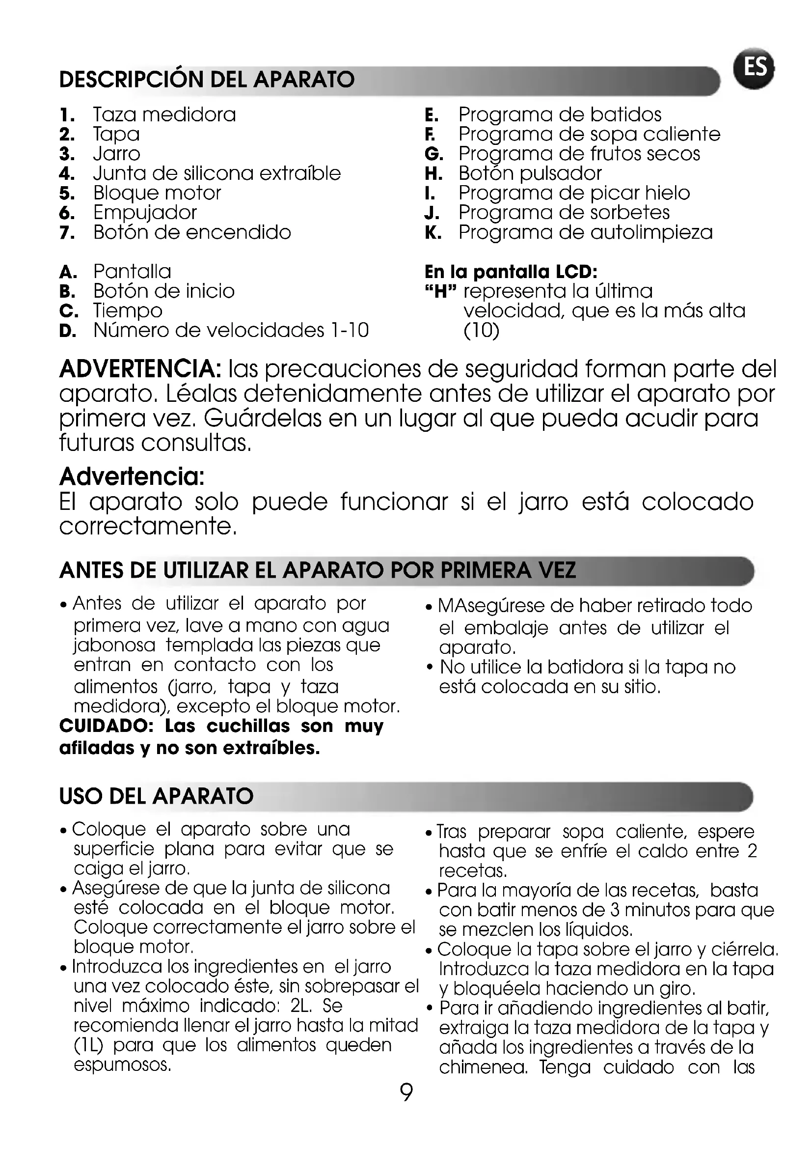 - No utilice la batidora si la tapa no está colocada en su sitio. ADVERTENCIA: las precauciones de seguridad forman parte del aparato. Léalas detenidamente antes de utilizar el aparato por primera vez. Guárdelas en un lugar al que pueda acudir para futuras consultas. Advertencia: El aparato solo puede funcionar si el jarro está colocado correctamente.