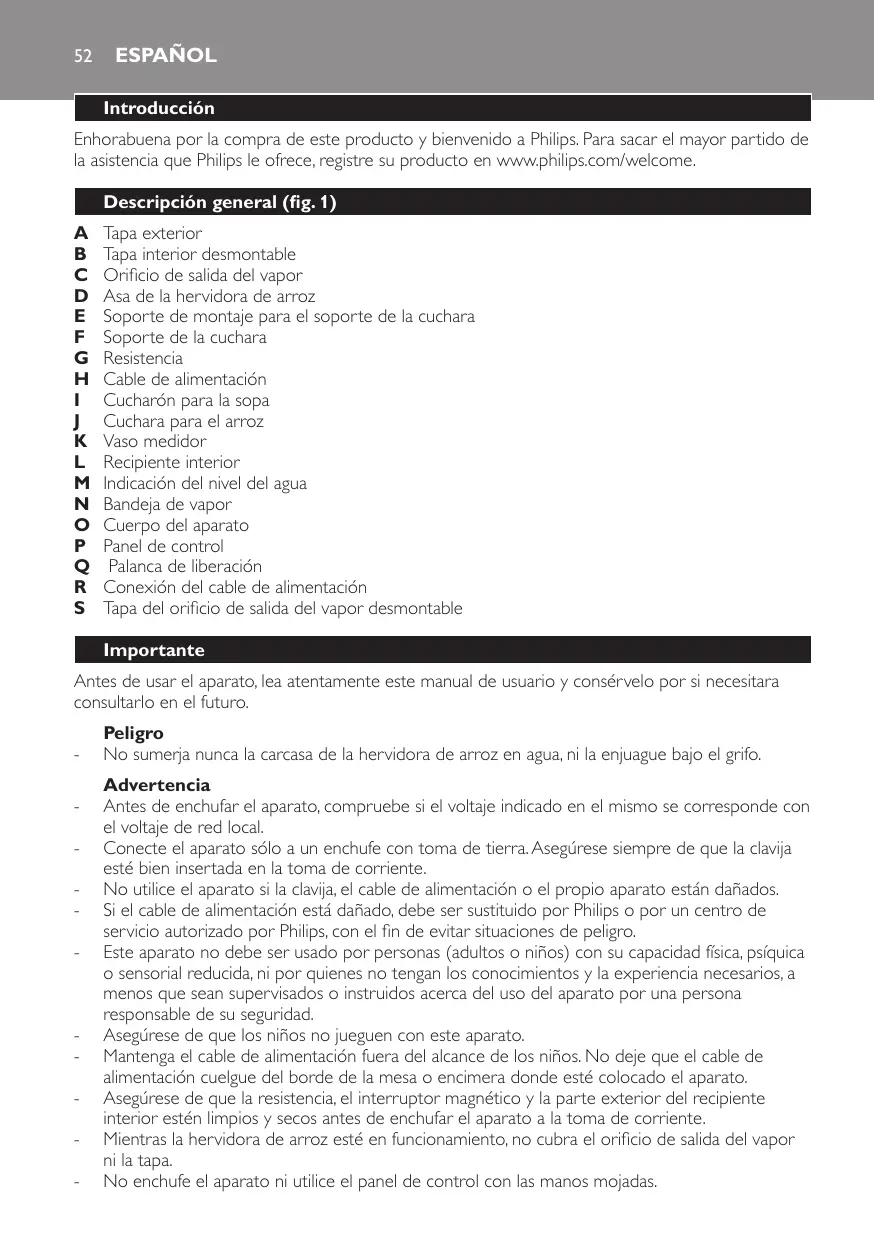 Peligro -- No sumerja nunca la carcasa de la hervidora de arroz en agua, ni la enjuague bajo el grifo. Advertencia -- Antes de enchufar el aparato, compruebe si el voltaje indicado en el mismo se corresponde con el voltaje de red local. -- Conecte el aparato sólo a un enchufe con toma de tierra. Asegúrese siempre de que la clavija esté bien insertada en la toma de corriente. -- No utilice el aparato si la clavija, el cable de alimentación o el propio aparato están dañados. -- Si el cable de alimentación está dañado, debe ser sustituido por Philips o por un centro de servicio autorizado por Philips, con el fin de evitar situaciones de peligro. -- Este aparato no debe ser usado por personas (adultos o niños) con su capacidad física, psíquica o sensorial reducida, ni por quienes no tengan los conocimientos y la experiencia necesarios, a menos que sean supervisados o instruidos acerca del uso del aparato por una persona responsable de su seguridad. -- Asegúrese de que los niños no jueguen con este aparato. -- Mantenga el cable de alimentación fuera del alcance de los niños. No deje que el cable de alimentación cuelgue del borde de la mesa o encimera donde esté colocado el aparato. -- Asegúrese de que la resistencia, el interruptor magnético y la parte exterior del recipiente interior estén limpios y secos antes de enchufar el aparato a la toma de corriente. -- Mientras la hervidora de arroz esté en funcionamiento, no cubra el orificio de salida del vapor ni la tapa. -- No enchufe el aparato ni utilice el panel de control con las manos mojadas.