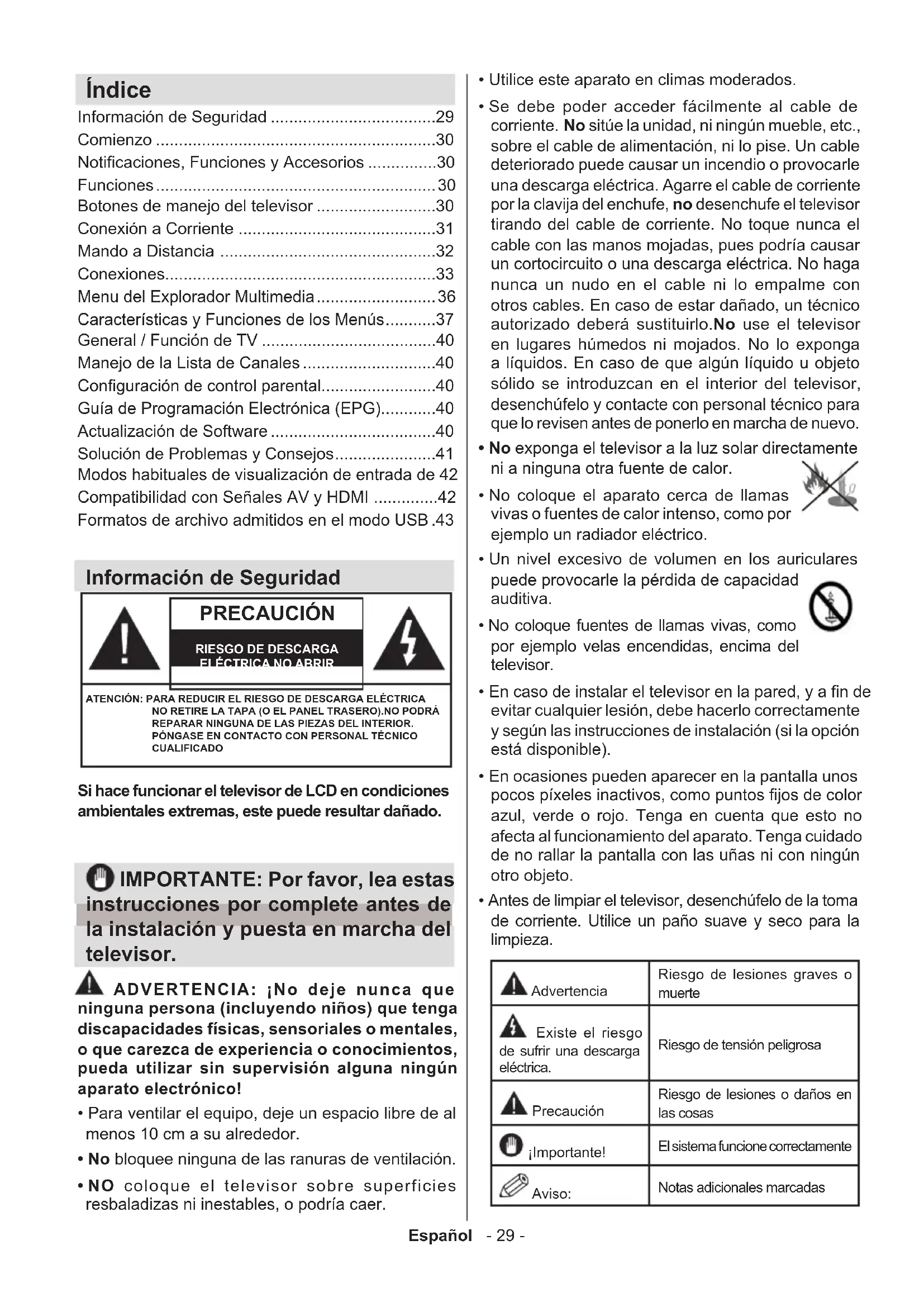 -Español - 29 - Información de Seguridad Si hace funcionar el televisor de LCD en condiciones ambientales extremas, este puede resultar dañado. PRECAUCIÓN RIESGO DE DESCARGA ELÉCTRICA NO ABRIRATENCIÓN: PARA REDUCIR EL RIESGO DE DESCARGA ELÉCTRICA NO RETIRE LA TAPA (O EL PANEL TRASERO).NO PODRÁ REPARAR NINGUNA DE LAS PIEZAS DEL INTERIOR. PÓNGASE EN CONTACTO CON PERSONAL TÉCNICO CUALIFICADO IMPORTANTE: Por favor, lea estas instrucciones por complete antes de la instalación y puesta en marcha del televisor. ADVERTENCIA: ¡No deje nunca que ninguna persona (incluyendo niños) que tenga discapacidades físicas, sensoriales o mentales, o que carezca de experiencia o conocimientos, pueda utilizar sin supervisión alguna ningún aparato electrónico!