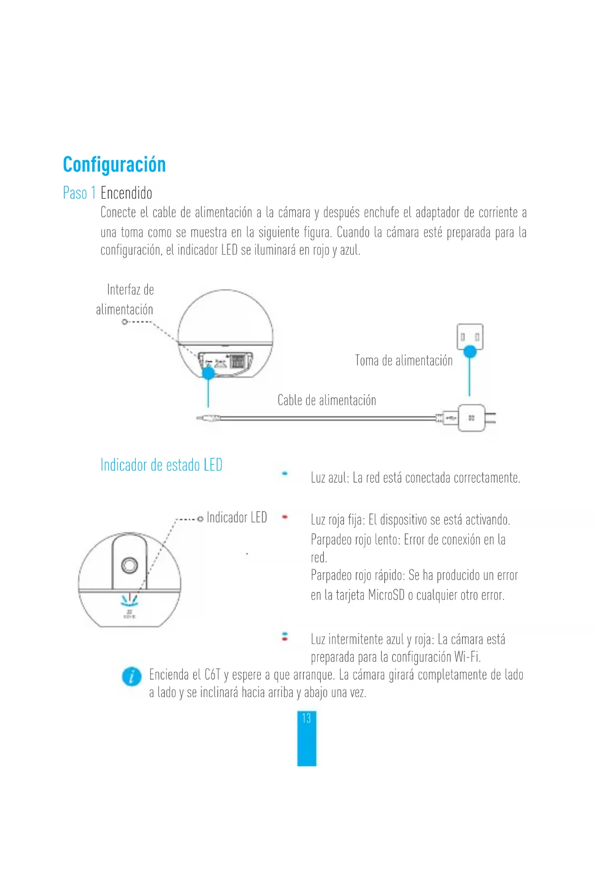 verbunden war, verbindet sie sich automatisch wieder mit diesem WLAN.12 Anhang Lieferumfang 1x C6T 1x Montagefuß 1x Stromkabel 1x Bohrschablone 1x Schraubensatz 1x Netzteil 1x Kurzanleitung13 Configuración Paso 1 Encendido Conecte el cable de alimentación a la cámara y después enchufe el adaptador de corriente a una toma como se muestra en la siguiente figura. Cuando la cámara esté preparada para la configuración, el indicador LED se iluminará en rojo y azul. Toma de alimentación Interfaz de alimentación Cable de alimentación Indicador de estado LED Luz azul: La red está conectada correctamente. Luz roja fija: El dispositivo se está activando. Parpadeo rojo lento: Error de conexión en la red. Parpadeo rojo rápido: Se ha producido un error en la tarjeta MicroSD o cualquier otro error. Luz intermitente azul y roja: La cámara está preparada para la configuración Wi-Fi. Indicador LED Encienda el C6T y espere a que arranque. La cámara girará completamente de lado a lado y se inclinará hacia arriba y abajo una vez.14 Paso 2 Configuración de la cámara
