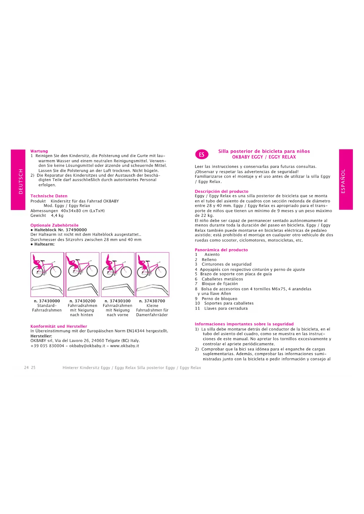 dos debe ser efectuada exclusivamente por personal autorizado.30 31 Fietsstoeltje achterop Eggy / Eggy Relax NEDERLANDS Silla posterior Eggy / Eggy Relax ESPAÑOL Datos técnicos Producto Silla de bicicleta para niños OKBABY mod. Eggy / Eggy Relax Dimensiones 40x34x80 CM (LxPxH) Peso 4,4 kg Accesorios opcionales