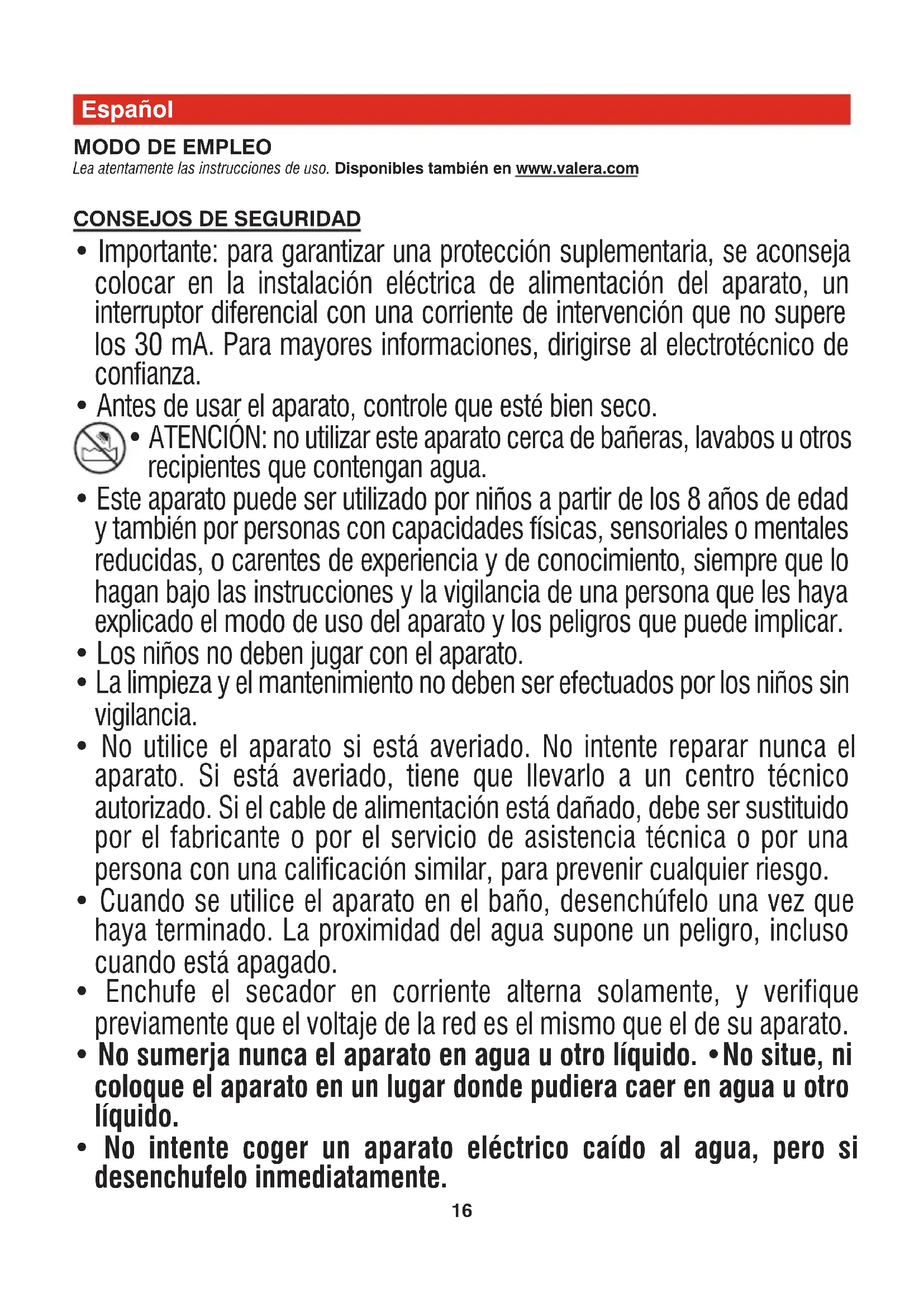reparado por personas no autorizadas. En caso de avería, se debe entregar el aparato bien embalado y con el certificado de garantía regularmente fechado y sellado por el vendedor, a uno de nuestros Centros de Asistencia autorizados o al vendedor, quien se encargará de remitirlo al importador oficial para efectuar la reparación de la garantía. Como consumidor de ete artículo, goza Vd. de los derechos que le reconoce la Ley de Garantías en la Venta de Bienes de Consumo 23/2003 (B.O.E. 11-07-03), en las condiciones que la misma establece. Recuerde que la fecha acreditada mediante el documento de compra, inicia el período de dos años previsto en la Ley. El fabricante además amplía el periodo de garantía establecida por la legislación vigente hasta un máximo de 36 meses para la gama de secadores de cabello. Hasta un máximo de 60 meses únicamente para el motor de los secadores con motores AC. Esta garantía es válida solamente para el uso doméstico. Para el uso profesional o análogo la garantía es de 12 meses en todos los modelos. IMPORTANTE Los secadores de cabello enumerados en esta norma de uso NO son adecuados para la instalación y el uso en estructuras públicas, gimnasios, wellness/fitness, clubes, spa, etc. con alta concurrencia. Para la instalación y el uso en pequeñas instalaciones públicas, gimnasios, wellness/fitness, clubes, spa, etc. con baja concurrencia, Valera recomienda exclusivamente los siguientes modelos: SN9000 P • 583.11/P • 584.02/IP. VALERA es una marca registrada de Ligo Electric S.A. - Suiza19 Nederlands GEBRUIKSAANWIJZING Lees aandachtig deze gebruiksaanwijzing vooraleer de haardroger te gebruiken. Ook beschikbaar op www.valera.com VEILIGHEIDSVOORSCHRIFTEN