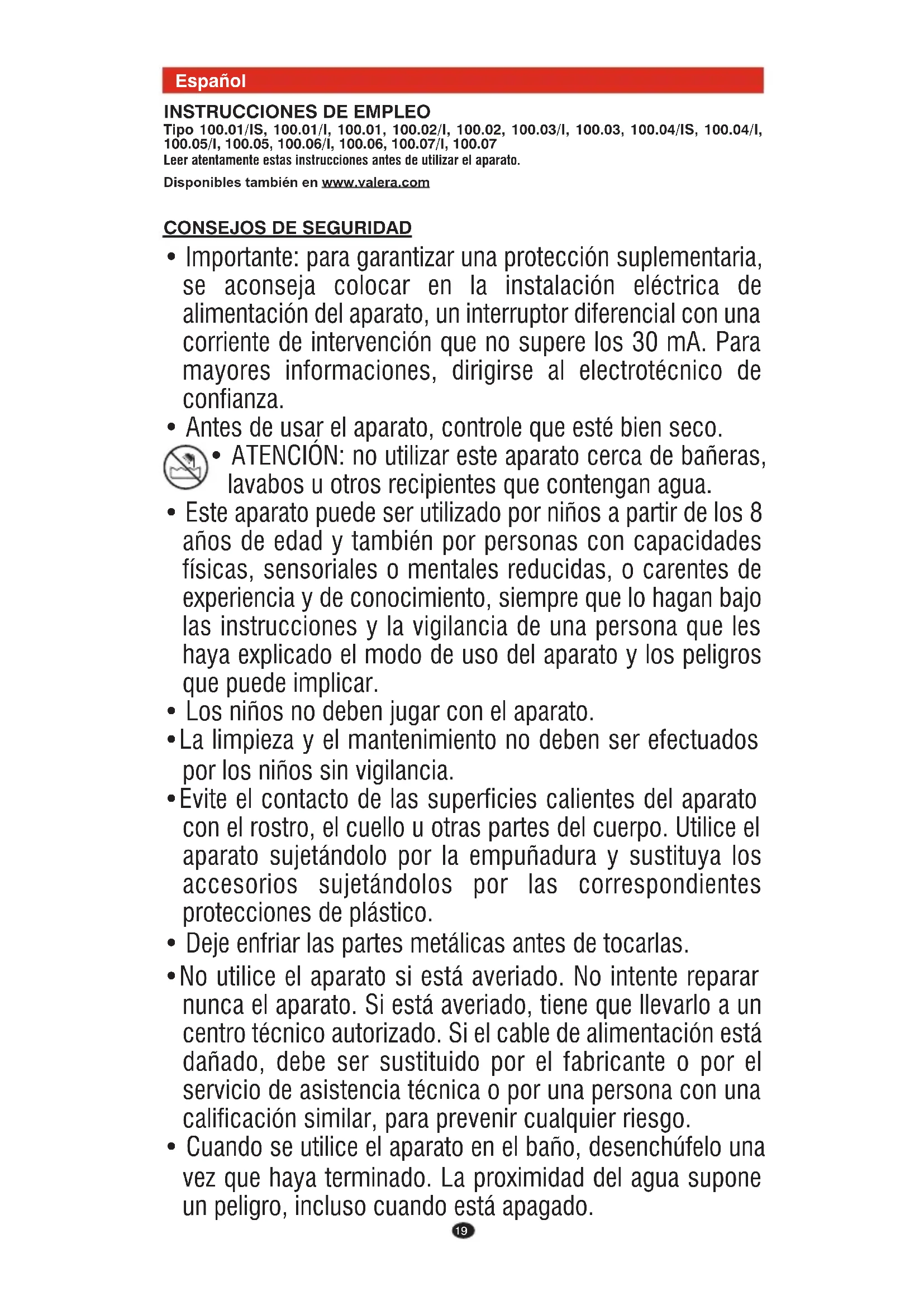 Tipo 100.01/IS, 100.01/I, 100.01, 100.02/I, 100.02, 100.03/I, 100.03, 100.04/IS, 100.04/I, 100.05/I, 100.05, 100.06/I, 100.06, 100.07/I, 100.07 Leer atentamente estas instrucciones antes de utilizar el aparato. Disponibles también en www.valera.com