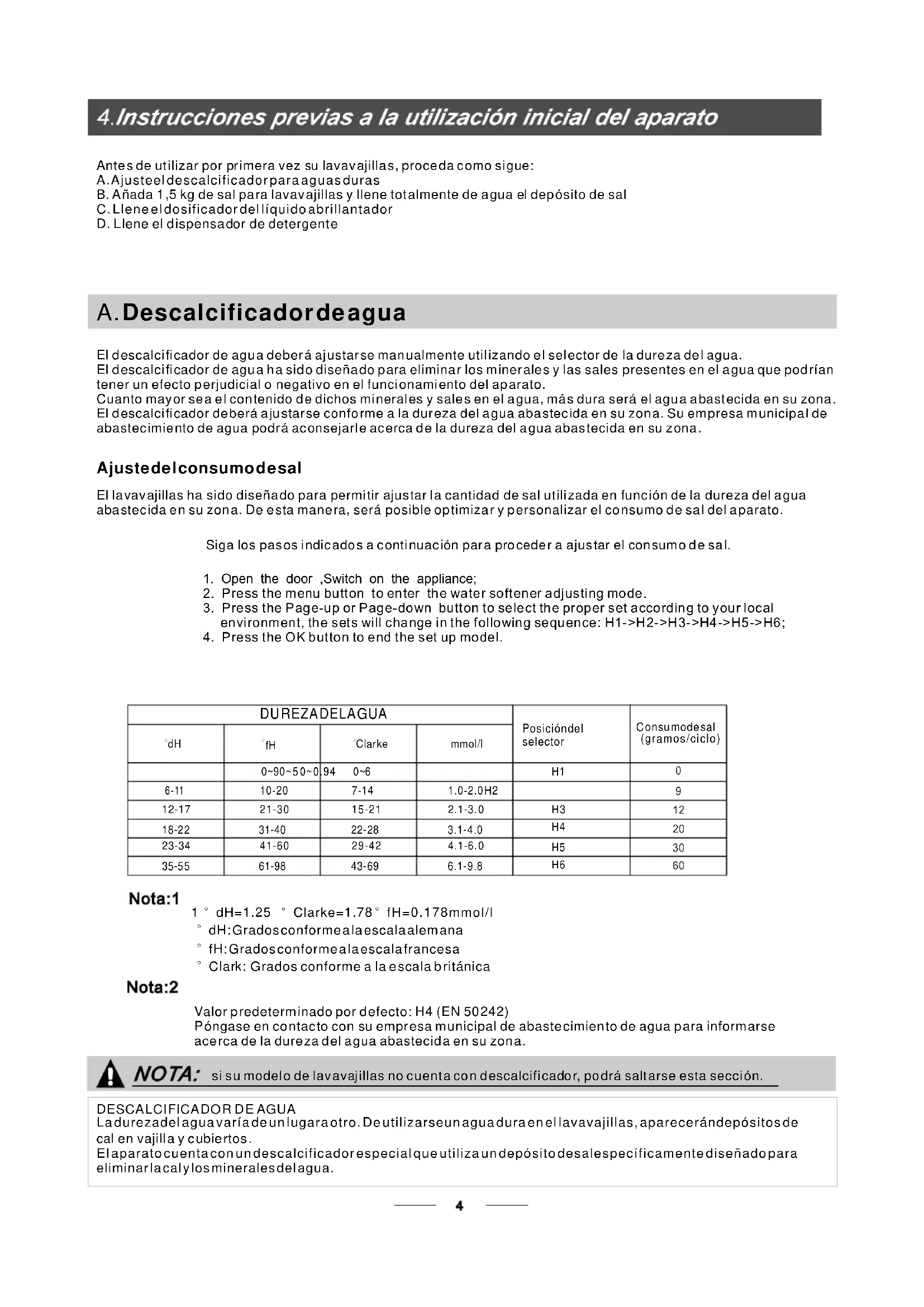 Ajustador 6.Display screen 3.OK button: to press the button to confirm your choice 2. Menu button : to press the button to display awash program information.4.Page-up button: to press the button to displaythe up page wash program information.1.On/Off button and indicator: to switch On/Off theappliance.and to show when the power on.5.Page-down button: to press the button to displaythe next page wash program information.El d escalci fi cador de agu a deber á aj ustar se man ualmente util izando e l sel ector de la dure za de l agua. El d escalci fi cador de agu a h a sid o diseña do p ara elimina r los m iner ale s y las sales presentes en el a gua que pod rían tener un efecto p erjudicial o negativo en el funci onami ento del ap arato. Cuanto may or se a e l con tenido d e dichos mi neral es y sale s en el a gua, má s dura será el agu a a bast ecida en su zona . El d escalci fi cador de berá a ju star se confo rme a la dur eza del a gua aba stec ida en su zon a. Su em presa m unicipa l de abastec imie nto de agua podr á ac onsejarl e ac erca d e la dureza del a gua abas tecida en su z ona . Ajuste de l consumo d e sal El la vav ajillas ha sido diseña do para permi tir ajus tar l a cantidad de sal ut ili zada en func ión de la dureza del a gua aba stec ida e n su zon a. De e sta mane ra, será posible op timiza r y p ersonalizar el co nsumo d e sa l del a parato. DESCA LCI FICA DO R D EAGUA La durezadel agua varía de un lugara otro. De utilizarseun agua dura en el lavavajillas, aparecerándepósitos de cal e n v aj il la y cub iert o s. El aparato cuenta con un descalcificador especial que utiliza un depósito desalespecíficamente diseñado para eliminar la cal y los minerales del agua. Si ga los p a sos indi ca dos a continu a ción p ara proced er a a j u star e l consumo de s al. A. Descalcificador de agua si s u model o de lav avaj illas no c uent a co n d escalcifi cado r, po drá salt arse esta secci ón. °Clark: Grados conforme a la e scala b ritánica °fH: Grados conforme a la escala francesa°dH: Grados conforme a la escala alem ana°dH=1.25°Clarke=1.78 °fH=0.178mmol/l