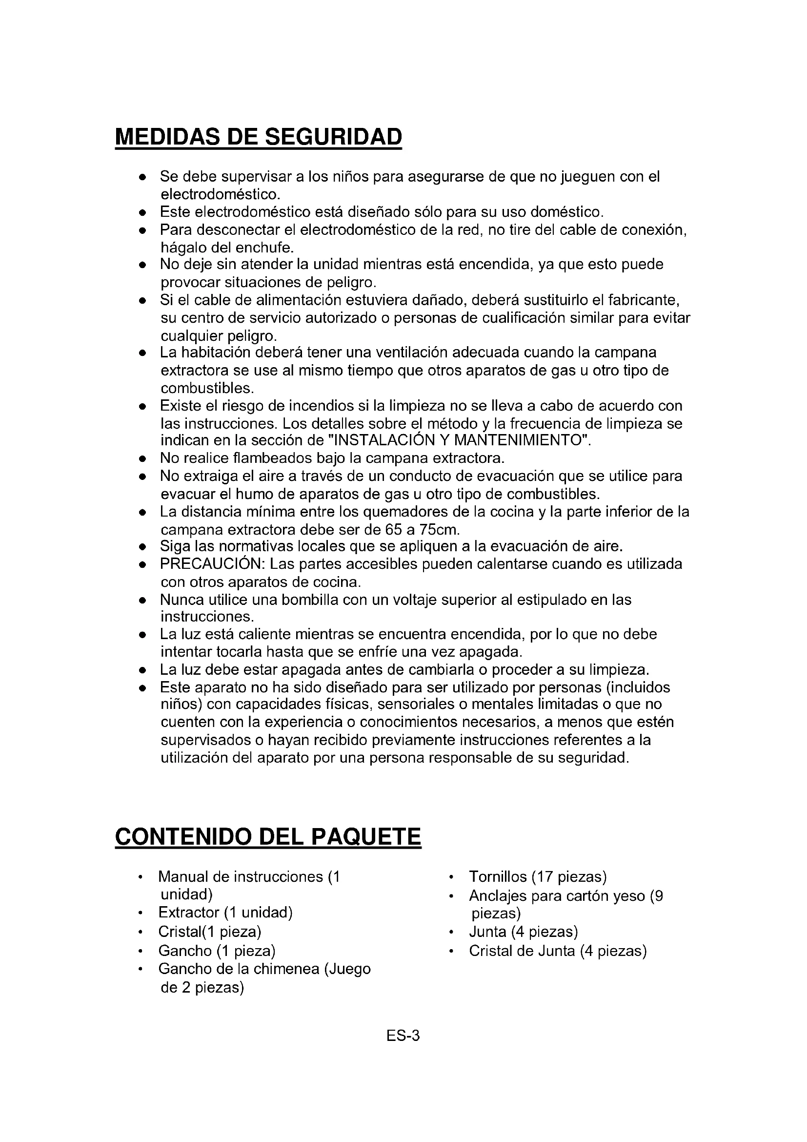 ● Se debe supervisar a los niños para asegurarse de que no jueguen con el electrodoméstico. ● Este electrodoméstico está diseñado sólo para su uso doméstico. ● Para desconectar el electrodoméstico de la red, no tire del cable de conexión, hágalo del enchufe. ● No deje sin atender la unidad mientras está encendida, ya que esto puede provocar situaciones de peligro. ● Si el cable de alimentación estuviera dañado, deberá sustituirlo el fabricante, su centro de servicio autorizado o personas de cualificación similar para evitar cualquier peligro. ● La habitación deberá tener una ventilación adecuada cuando la campana extractora se use al mismo tiempo que otros aparatos de gas u otro tipo de combustibles. ● Existe el riesgo de incendios si la limpieza no se lleva a cabo de acuerdo con las instrucciones. Los detalles sobre el método y la frecuencia de limpieza se indican en la sección de "INSTALACIÓN Y MANTENIMIENTO". ● No realice flambeados bajo la campana extractora. ● No extraiga el aire a través de un conducto de evacuación que se utilice para evacuar el humo de aparatos de gas u otro tipo de combustibles. ● La distancia mínima entre los quemadores de la cocina y la parte inferior de la campana extractora debe ser de 65 a 75cm. ● Siga las normativas locales que se apliquen a la evacuación de aire. ● PRECAUCIÓN: Las partes accesibles pueden calentarse cuando es utilizada con otros aparatos de cocina. ● Nunca utilice una bombilla con un voltaje superior al estipulado en las instrucciones. ● La luz está caliente mientras se encuentra encendida, por lo que no debe intentar tocarla hasta que se enfríe una vez apagada. ● La luz debe estar apagada antes de cambiarla o proceder a su limpieza. ● Este aparato no ha sido diseñado para ser utilizado por personas (incluidos niños) con capacidades físicas, sensoriales o mentales limitadas o que no cuenten con la experiencia o conocimientos necesarios, a menos que estén supervisados o hayan recibido previamente instrucciones referentes a la utilización del aparato por una persona responsable de su seguridad.