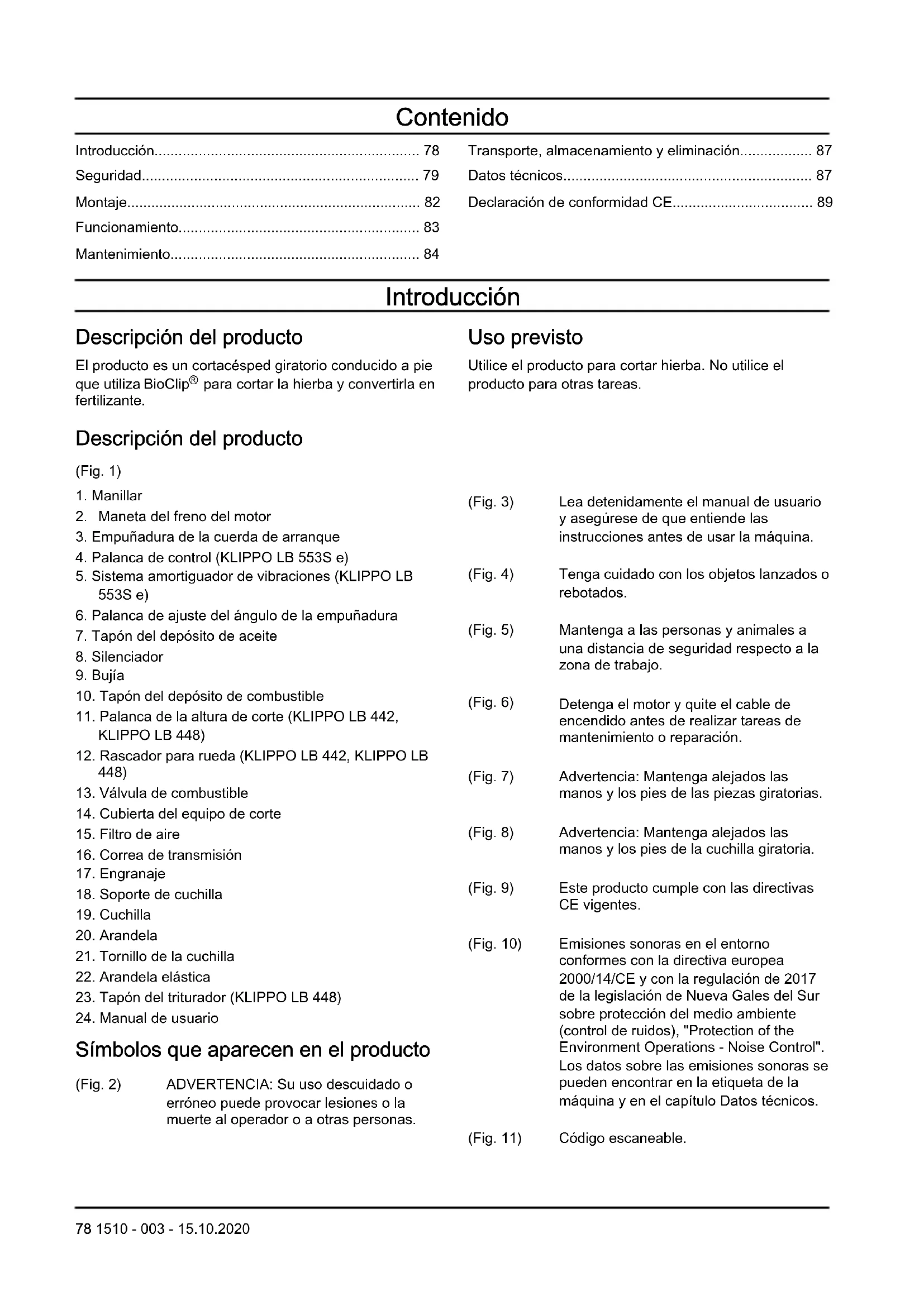 Símbolos que aparecen en el producto (Fig. 2) ADVERTENCIA: Su uso descuidado o erróneo puede provocar lesiones o la muerte al operador o a otras personas. (Fig. 3) Lea detenidamente el manual de usuario y asegúrese de que entiende las instrucciones antes de usar la máquina. (Fig. 4) Tenga cuidado con los objetos lanzados o rebotados. (Fig. 5) Mantenga a las personas y animales a una distancia de seguridad respecto a la zona de trabajo. (Fig. 6) Detenga el motor y quite el cable de encendido antes de realizar tareas de mantenimiento o reparación. (Fig. 7) Advertencia: Mantenga alejados las manos y los pies de las piezas giratorias. (Fig. 8) Advertencia: Mantenga alejados las manos y los pies de la cuchilla giratoria. (Fig. 9) Este producto cumple con las directivas CE vigentes. (Fig. 10) Emisiones sonoras en el entorno conformes con la directiva europea 2000/14/CE y con la regulación de 2017 de la legislación de Nueva Gales del Sur sobre protección del medio ambiente (control de ruidos), "Protection of the Environment Operations - Noise Control". Los datos sobre las emisiones sonoras se pueden encontrar en la etiqueta de la máquina y en el capítulo Datos técnicos. (Fig. 11) Código escaneable. 78 1510 - 003 - 15.10.2020Nota: Los demás símbolos/etiquetas que aparecen en el producto corresponden a requisitos de homologación específicos de algunas zonas comerciales. Emisiones Euro V ADVERTENCIA: La manipulación del motor anula la homologación de la UE de este producto. Responsabilidad sobre el producto Como se estipula en las leyes de responsabilidad del producto, no nos hacemos responsables de los daños y perjuicios causados por nuestro producto si:
