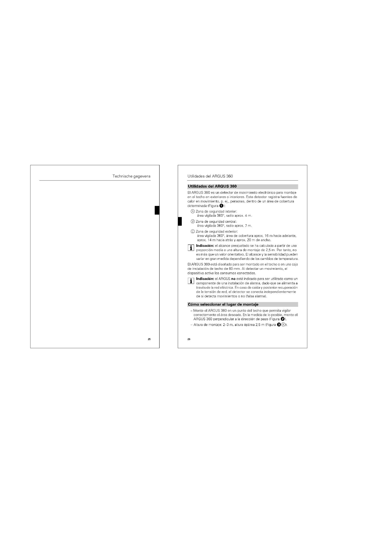 i Indicación: el ARGUS no está indicado para ser utilizado como un componente de una instalación de alarma, dado que se alimenta a través de la red eléctrica. En caso de caída y posterior recuperación de la tensión de red, el detector se conecta independientemente de si detecta movimientos o no ífalsa alarmal.