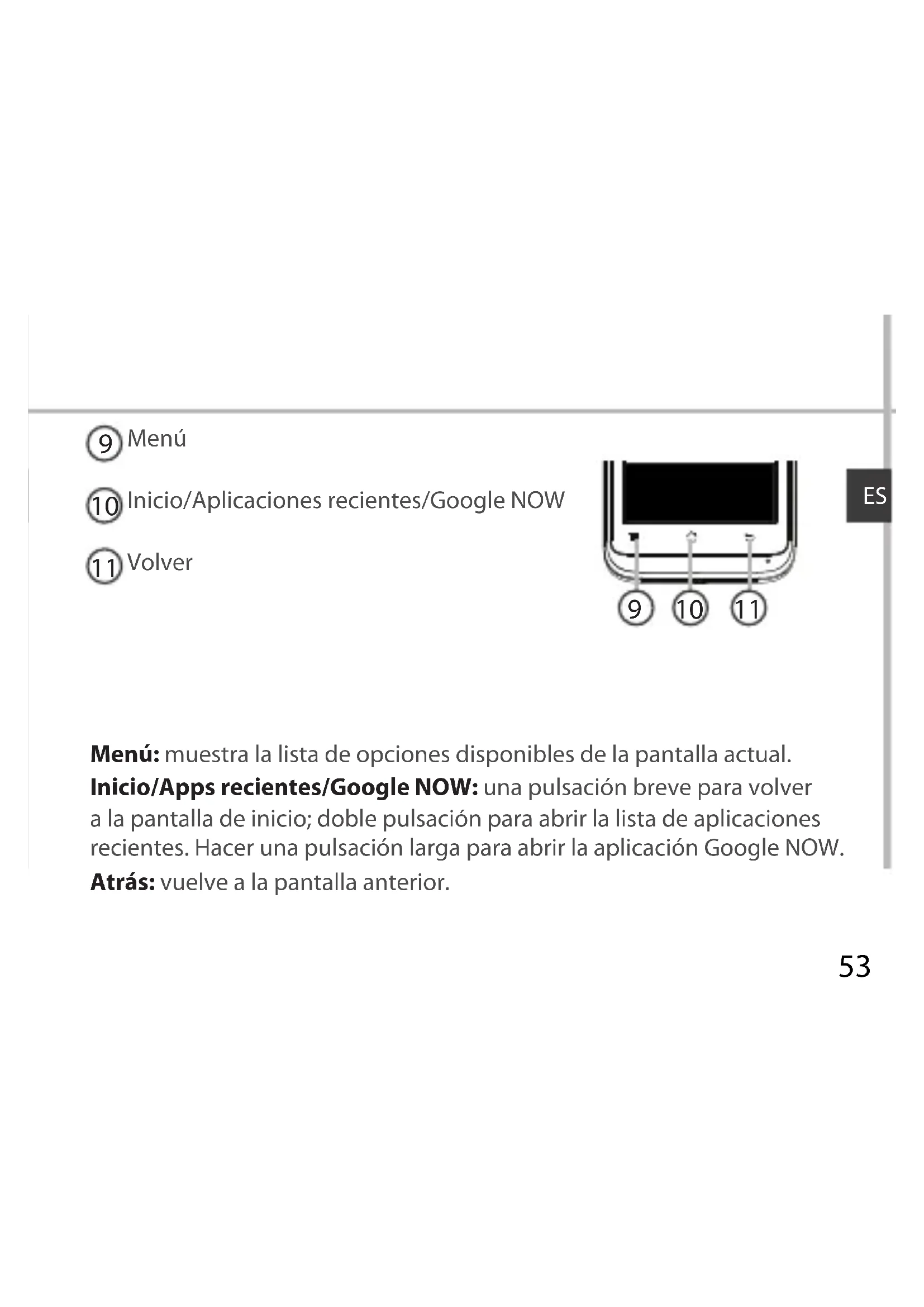 Menú: muestra la lista de opciones disponibles de la pantalla actual. Inicio/Apps recientes/Google NOW: una pulsación breve para volver a la pantalla de inicio; doble pulsación para abrir la lista de aplicaciones recientes. Hacer una pulsación larga para abrir la aplicación Google NOW. Atrás: vuelve a la pantalla anterior.54 Ensamblado Abrir