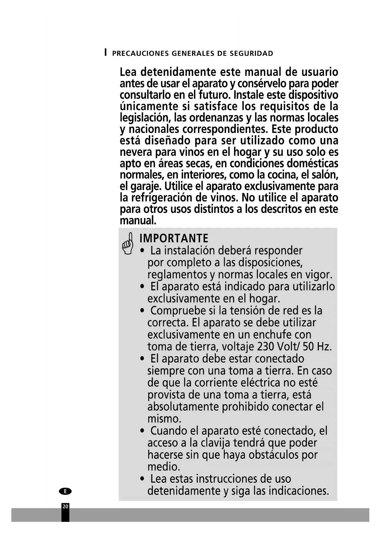 - La nevera para vinos es un aparato seguro, fabricado en conformidad con las normas de seguridad CE (Conformidad Europea).A pesar de ello, y al igual que con todo aparato eléctrico, se debe obrar con cautela.