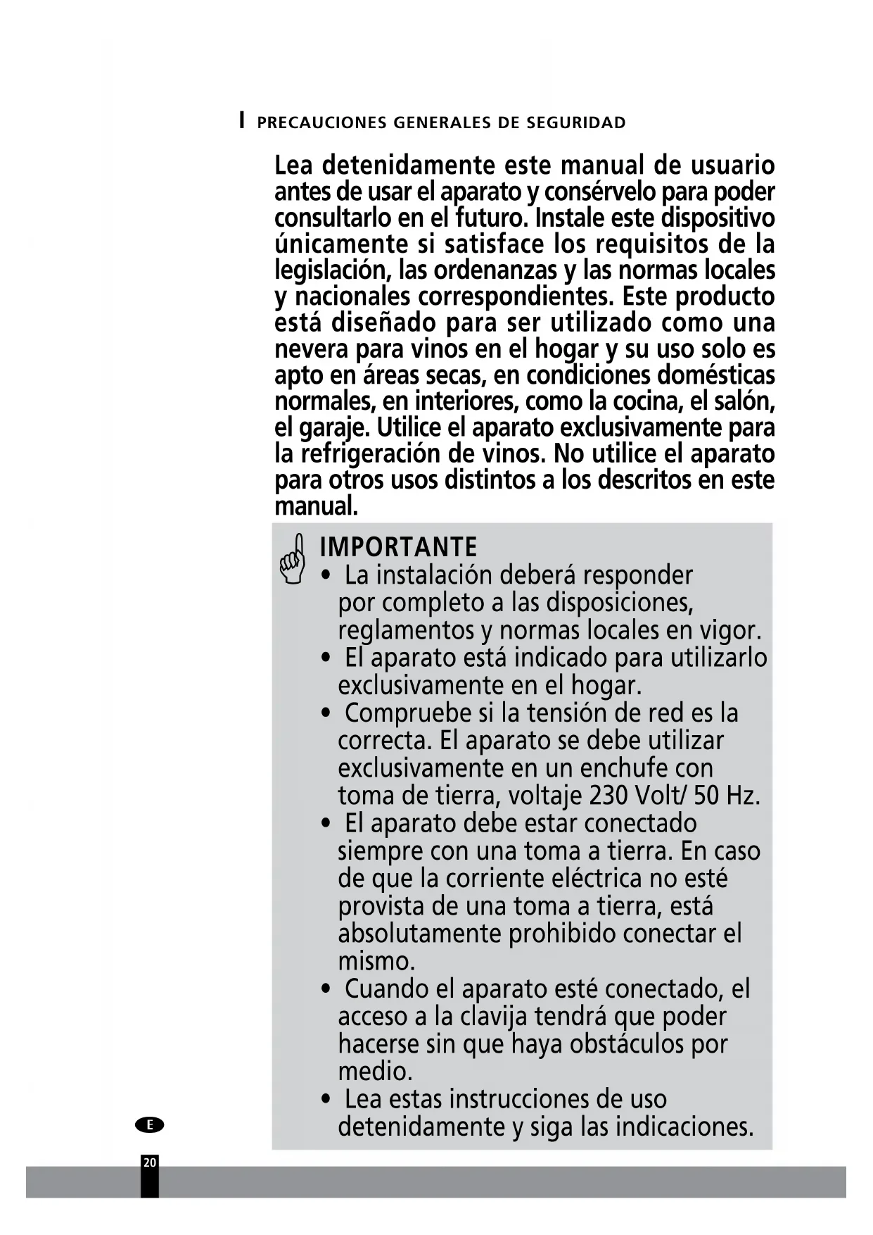 Lea detenidamente este manual de usuario antes de usar el aparato y consérvelo para poder consultarlo en el futuro. Instale este dispositivo únicamente si satisface los requisitos de la legislación, las ordenanzas y las normas locales y nacionales correspondientes. Este producto está diseñado para ser utilizado como una nevera para vinos en el hogar y su uso solo es apto en áreas secas, en condiciones domésticas normales, en interiores, como la cocina, el salón, el garaje. Utilice el aparato exclusivamente para la refrigeración de vinos. No utilice el aparato para otros usos distintos a los descritos en este manual.