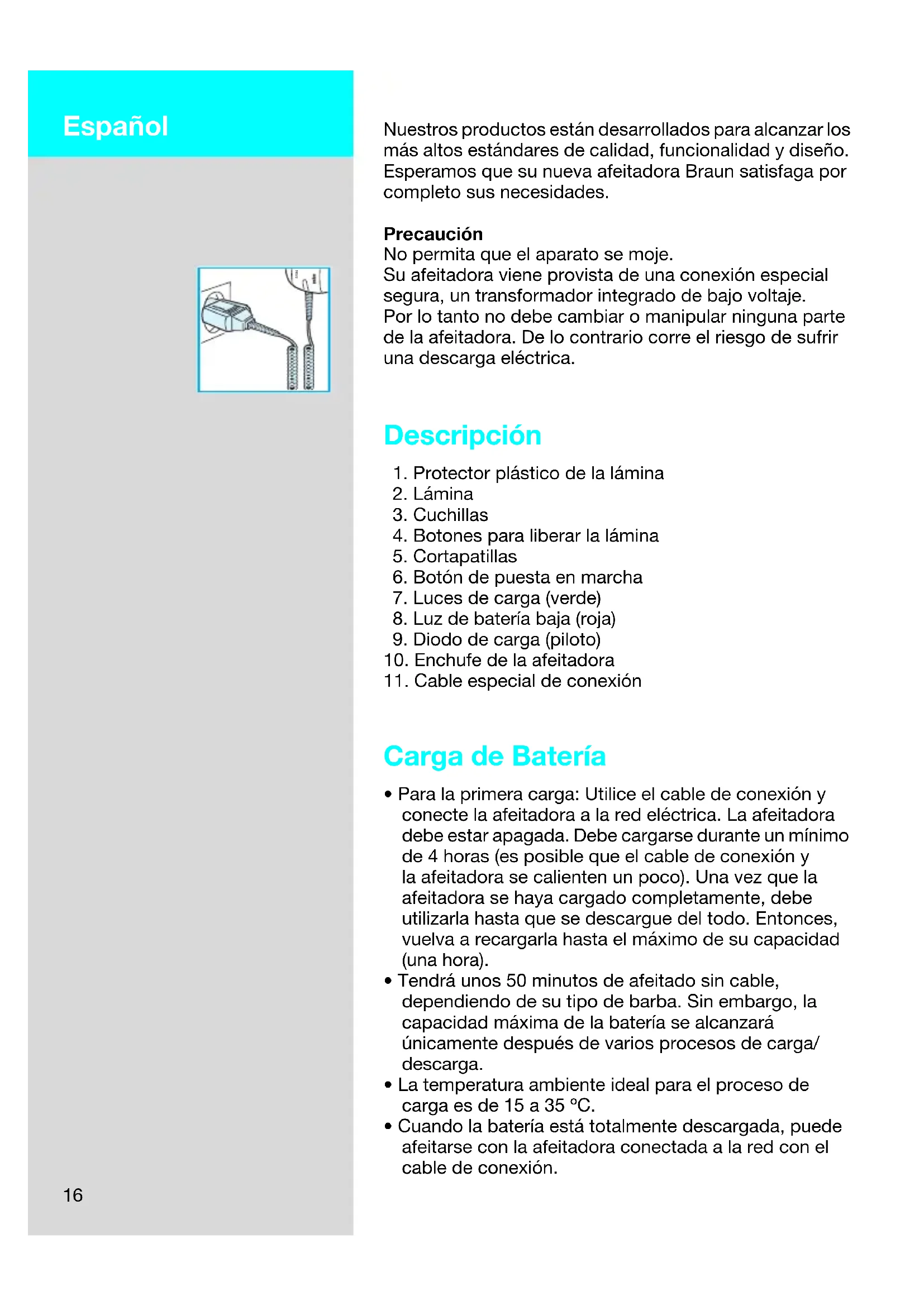 5644319_Activator_8588/83_S4_66 Seite 15 Montag, 11. April 2005 11:11 1116 Nuestros productos están desarrollados para alcanzar los más altos estándares de calidad, funcionalidad y diseño. Esperamos que su nueva afeitadora Braun satisfaga por completo sus necesidades. Precaución No permita que el aparato se moje. Su afeitadora viene provista de una conexión especial segura, un transformador integrado de bajo voltaje. Por lo tanto no debe cambiar o manipular ninguna parte de la afeitadora. De lo contrario corre el riesgo de sufrir una descarga eléctrica. Descripción