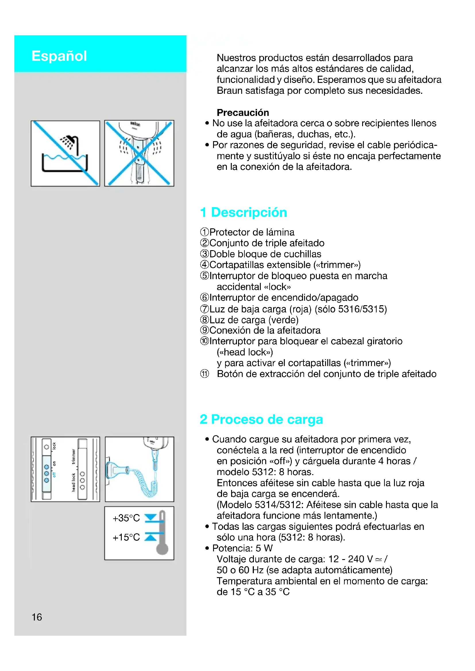 - Por razones de seguridad, revise el cable periódica- mente y sustitúyalo si éste no encaja perfectamente en la conexión de la afeitadora. 1 Descripción 1 Protector de lámina 2 Conjunto de triple afeitado 3 Doble bloque de cuchillas 4 Cortapatillas extensible («trimmer») 5 Interruptor de bloqueo puesta en marcha accidental «lock» 6 Interruptor de encendido/apagado 7 Luz de baja carga (roja) (sólo 5316/5315) 8 Luz de carga (verde) 9 Conexión de la afeitadora j Interruptor para bloquear el cabezal giratorio («head lock») y para activar el cortapatillas («trimmer») k Botón de extracción del conjunto de triple afeitado 2 Proceso de carga