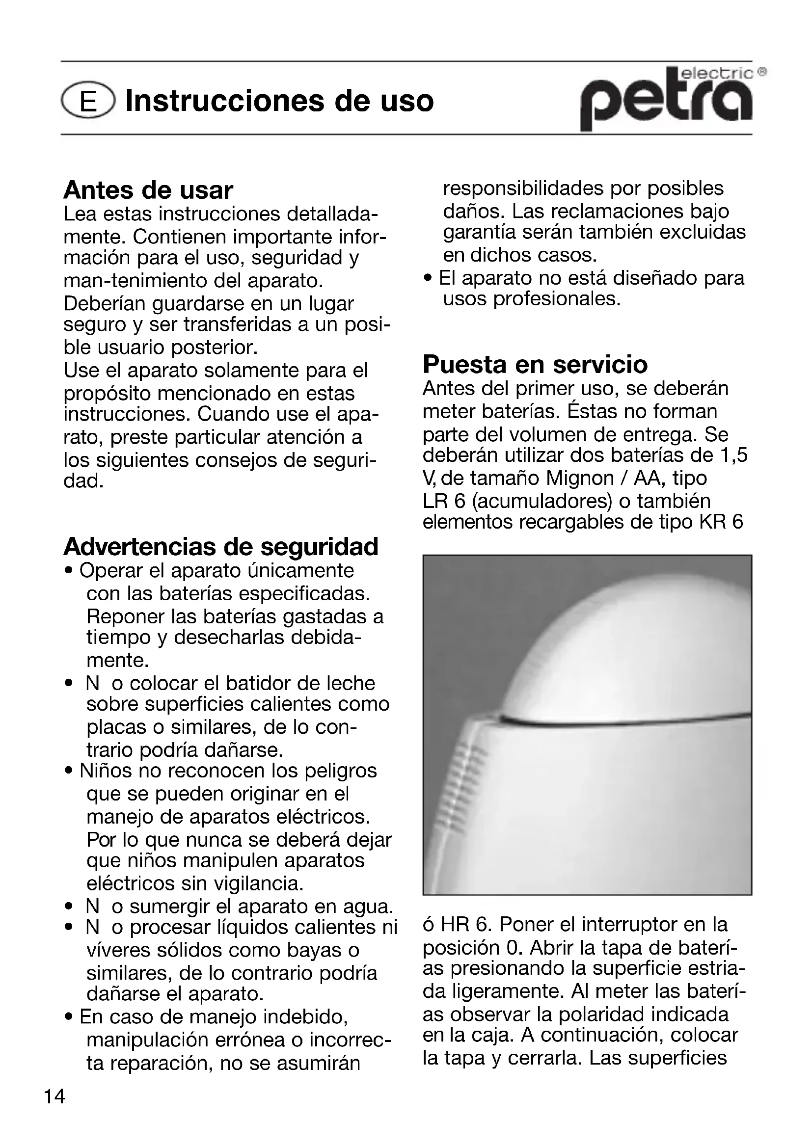 - El aparato no está diseñado para usos profesionales. Puesta en servicio Antes del primer uso, se deberán meter baterías. Éstas no forman parte del volumen de entrega. Se deberán utilizar dos baterías de 1,5 V, de tamaño Mignon / AA, tipo LR 6 (acumuladores) o también elementos recargables de tipo KR 6 ó HR 6. Poner el interruptor en la posición 0. Abrir la tapa de baterí- as presionando la superficie estria- da ligeramente. Al meter las baterí- as observar la polaridad indicada en la caja. A continuación, colocar la tapa y cerrarla. Las superficies