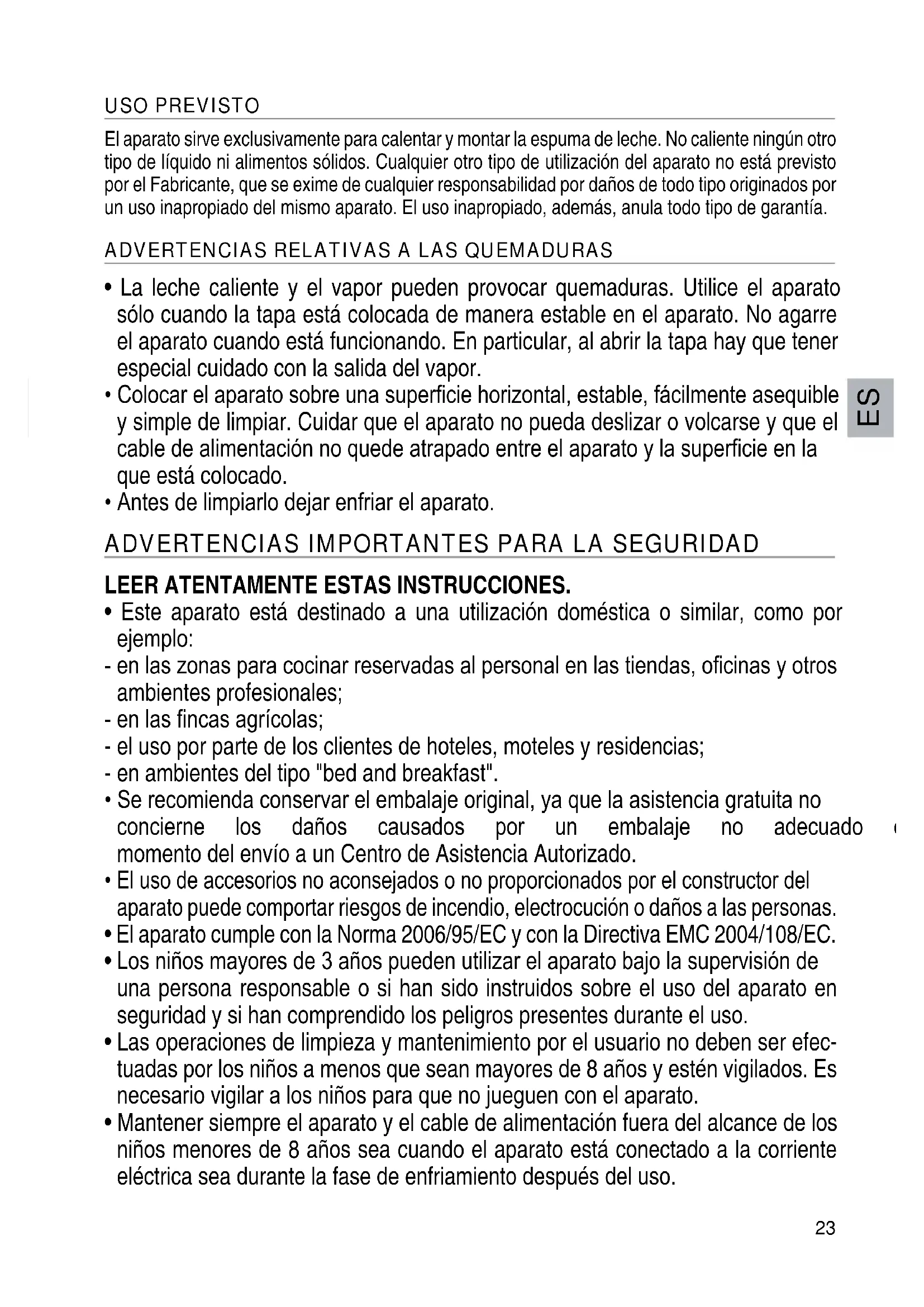 El aparato sirve exclusivamente para calentar y montar la espuma de leche. No caliente ningún otro tipo de liquido ni alimentos solidos. Cualquier除外 tipo de uso del aparato no está previsto por el Fabricante, que se exime de cualquier responsabilidad por daños de todo tipo originados por un uso inapropiado del本身就是 aparato. El uso inapropiado, además, anula todos tipo de garantía.