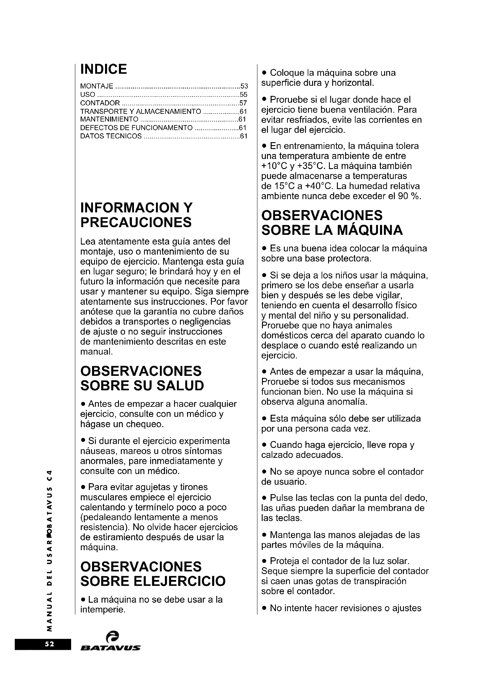 - El equipo ha sido diseñado para un uso en casa. La garantía Batavus se aplica sólo a defectos o malfunctionamiento en un uso en casa (24 meses). Para consultas concernientes a la garantía diríjase a su proprio distribuitor Batavus. Observe que las condiciones de la garantia pueden variar con arreglo al área de mercado.