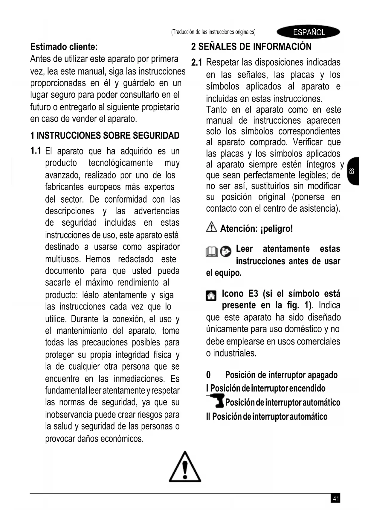 Respetar las disposiciones indicadas en las señales, las placas y los símbolos aplicados al aparato e incluidas en estas instrucciones. Tanto en el aparato como en este manual de instrucciones aparecen solo los símbolos correspondientes al aparato comprado. Verificar que las placas y los símbolos aplicados al aparato siempre estén íntegros y que sean perfectamente legibles; de no ser así, sustituirlos sin modificar su posición original (ponerse en contacto con el centro de asistencia). Atención: ¡peligro! Leer atentamente estas instrucciones antes de usar el equipo. Icono E3 (si el símbolo está presente en la fig. 1). Indica que este aparato ha sido diseñado únicamente para uso doméstico y no debe emplearse en usos comerciales o industriales.