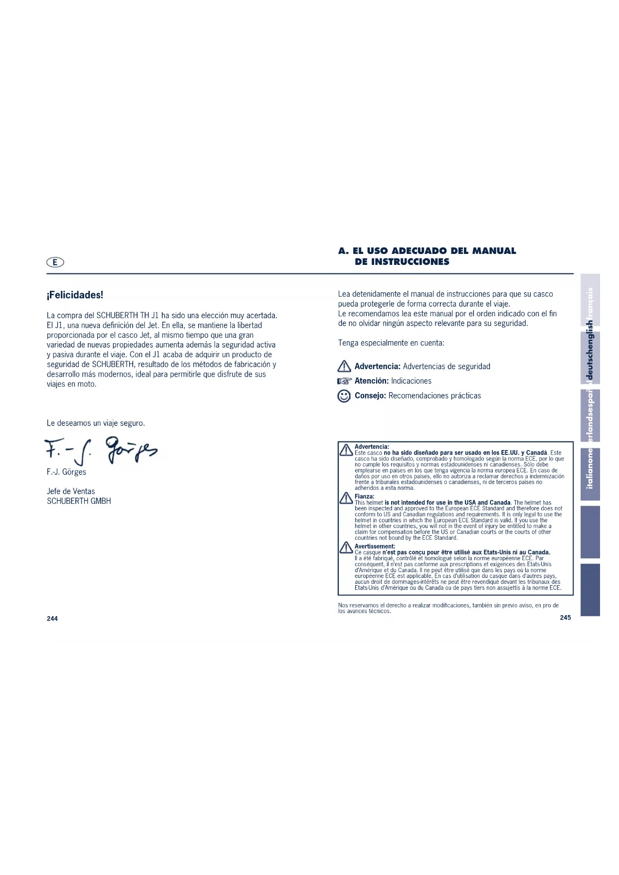 Zetel Telefon Adres +49 (0)391 8106-0 SCHUBERTH Gruppe Stegelitzer Str. 12 39126 Magdeburg Duitsland Service Center Telefon Adres +49 (0)391 8106-555 SCHUBERTH GmbH Service Center Stegelitzer Str. 12 39126 Magdeburg Duitsland Internet www.schuberth.com E-Mail kundenservice@schuberth.com SH_MAN_J1_10_10_V01_NL_SH05011_Manual_J1_V07_NL.qxd 03.11.10 13:04 Seite 242Lea detenidamente el manual de instrucciones para que su casco pueda protegerle de forma correcta durante el viaje. Le recomendamos lea este manual por el orden indicado con el fin de no olvidar ningún aspecto relevante para su seguridad. Tenga especialmente en cuenta: Advertencia: Advertencias de seguridad Atención: Indicaciones Consejo: Recomendaciones prácticas Advertencia: Este casco no ha sido diseñado para ser usado en los EE.UU. y Canadá. Este casco ha sido diseñado, comprobado y homologado según la norma ECE, por lo que no cumple los requisitos y normas estadounidenses ni canadienses. Sólo debe emplearse en países en los que tenga vigencia la norma europea ECE. En caso de daños por uso en otros países, ello no autoriza a reclamar derechos a indemnización frente a tribunales estadounidenses o canadienses, ni de terceros países no adheridos a esta norma. Fianza: This helmet is not intended for use in the USA and Canada. The helmet has been inspected and approved to the European ECE Standard and therefore does not conform to US and Canadian regulations and requirements. It is only legal to use the helmet in countries in which the European ECE Standard is valid. If you use the helmet in other countries, you will not in the event of injury be entitled to make a claim for compensation before the US or Canadian courts or the courts of other countries not bound by the ECE Standard.