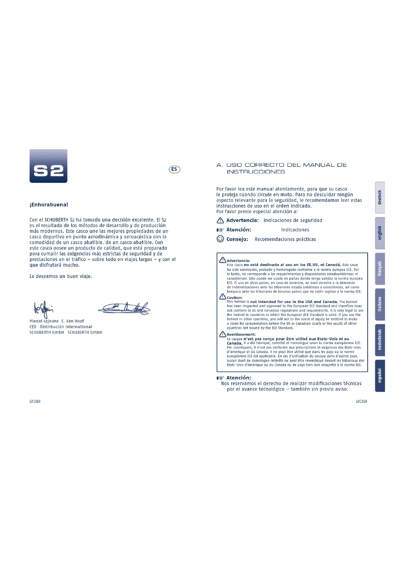 Ce casque n’est pas conçu pour être utilisé aux Etats-Unis ni au Canada. Il a été fabriqué, contrôlé et homologué selon la norme européenne ECE. Par conséquent, il n’est pas conforme aux prescriptions et exigences des Etats-Unis d’Amérique et du Canada. Il ne peut être utilisé que dans les pays où la norme européenne ECE est applicable. En cas d’utilisation du casque dans d’autres pays, aucun droit de dommages-intérêts ne peut être revendiqué devant les tribunaux des Etats-Unis d’Amérique ou du Canada ou de pays tiers non assujettis à la norme ECE. Atención: Nos reservamos el derecho de realizar modificaciones técnicas por el avance tecnológico – también sin previo aviso. ¡Enhorabuena! Con el SCHUBERTH S2 ha tomado una decisión excelente. El S2 es el resultado de los métodos de desarrollo y de producción más modernos. Este casco une las mejores propiedades de un casco deportivo en punto aerodinámica y aeroacústica con la comodidad de un casco abatible. de un casco abatible. Con este casco posee un producto de calidad, que está preparado para cumplir las exigencias más estrictas de seguridad y de prestaciones en el tráfico – sobre todo en viajes largos – y con el que disfrutará mucho. Le deseamos un buen viaje. Marcel Lejeune E. Van Hoof CEO Distribución International SCHUBERTH GmbH SCHUBERTH GmbH A. USO CORRECTO DEl MANUAl DE INSTRUCCIONES ES240 241 español nederlands italiano français english deutsch F. Para su seguridad ......................................... 272