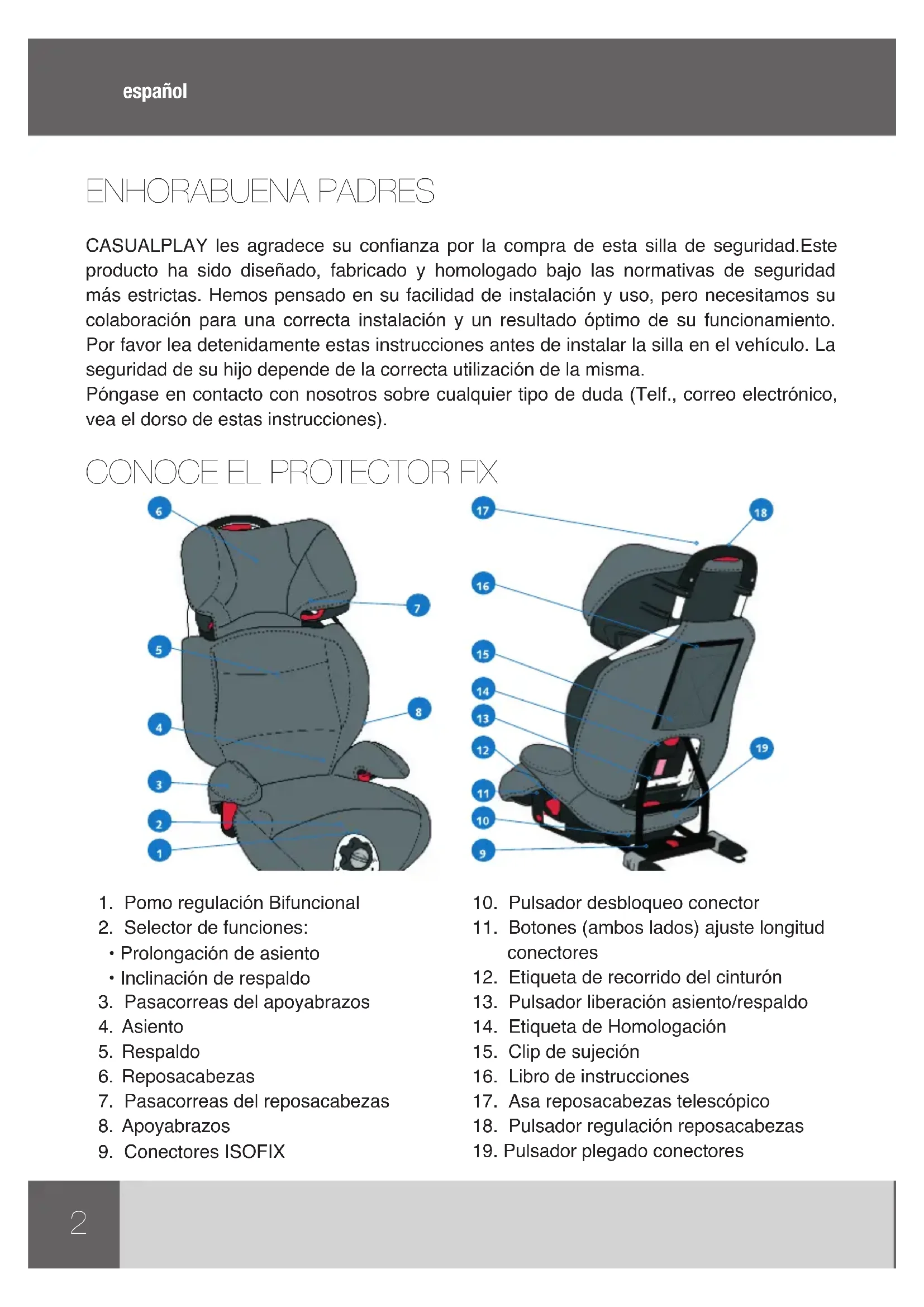 ENHORABUENA PADRES CASUALPLAY les agradece su confianza por la compra de esta silla de seguridad.Este producto ha sido diseñado, fabricado y homologado bajo las normativas de seguridad más estrictas. Hemos pensado en su facilidad de instalación y uso, pero necesitamos su colaboración para una correcta instalación y un resultado óptimo de su funcionamiento. Por favor lea detenidamente estas instrucciones antes de instalar la silla en el vehículo. La seguridad de su hijo depende de la correcta utilización de la misma. Póngase en contacto con nosotros sobre cualquier tipo de duda (Telf., correo electrónico, vea el dorso de estas instrucciones).