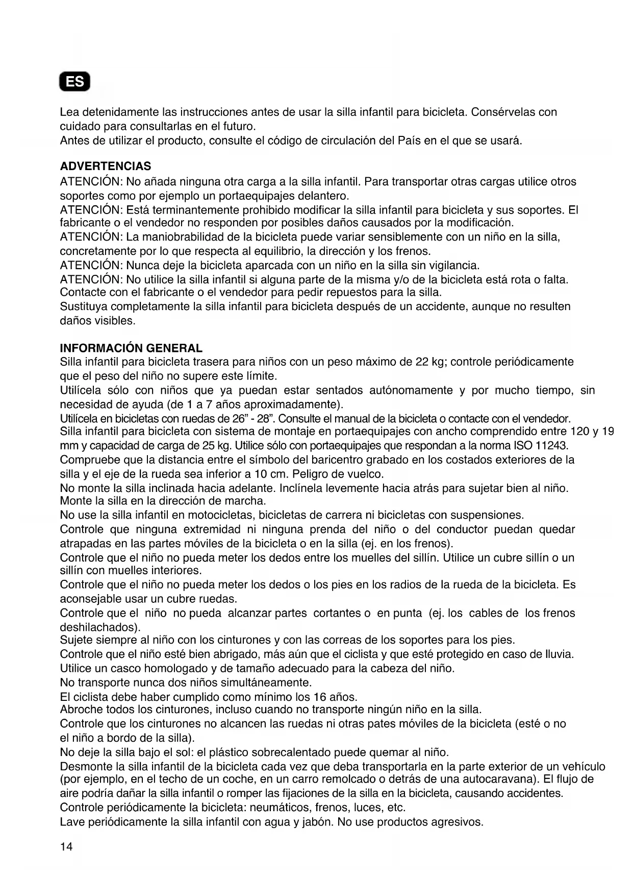 DE14 Lea detenidamente las instrucciones antes de usar la silla infantil para bicicleta. Consérvelas con cuidado para consultarlas en el futuro. Antes de utilizar el producto, consulte el código de circulación del País en el que se usará. ADVERTENCIAS ATENCIÓN: No añada ninguna otra carga a la silla infantil. Para transportar otras cargas utilice otros soportes como por ejemplo un portaequipajes delantero. ATENCIÓN: Está terminantemente prohibido modicar la silla infantil para bicicleta y sus soportes. El fabricante o el vendedor no responden por posibles daños causados por la modicación. ATENCIÓN: La maniobrabilidad de la bicicleta puede variar sensiblemente con un niño en la silla, concretamente por lo que respecta al equilibrio, la dirección y los frenos. ATENCIÓN: Nunca deje la bicicleta aparcada con un niño en la silla sin vigilancia. ATENCIÓN: No utilice la silla infantil si alguna parte de la misma y/o de la bicicleta está rota o falta. Contacte con el fabricante o el vendedor para pedir repuestos para la silla. Sustituya completamente la silla infantil para bicicleta después de un accidente, aunque no resulten daños visibles.