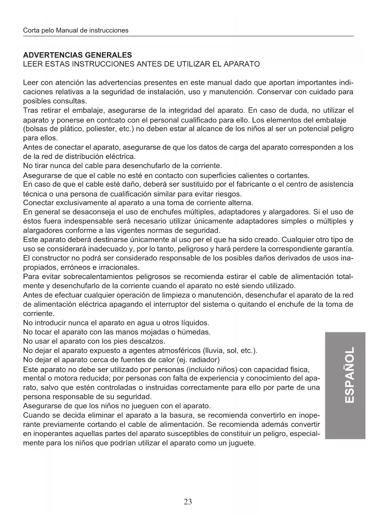 - controlar que el cortador deleo esté limpio, sin cabello ni sociedad. Si fuera necessario, echar una gota de aceite entre los dientes de las cucillas;