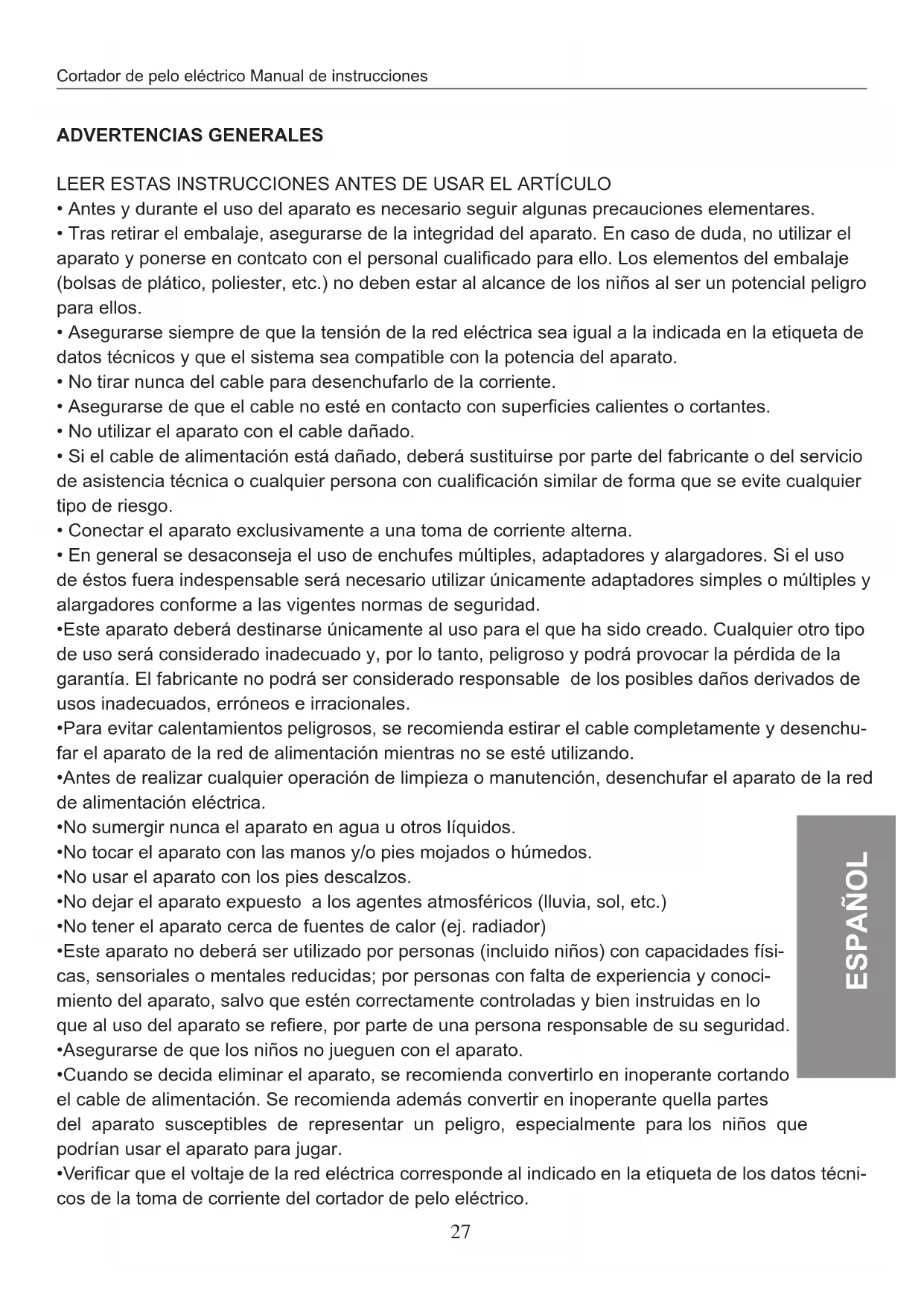 - Este aparato deben delegarly designar unicolemente al uso para el que ha sido createo. Cualquier other tipo de uso sera considerado inadequado y, por lo tanto, peligroso y podra provocar la perdida de la garantia. El fabricante no podra ser considerado responsable de los posibles daños derivados de usos inadequados, erroneos e irraciones.
