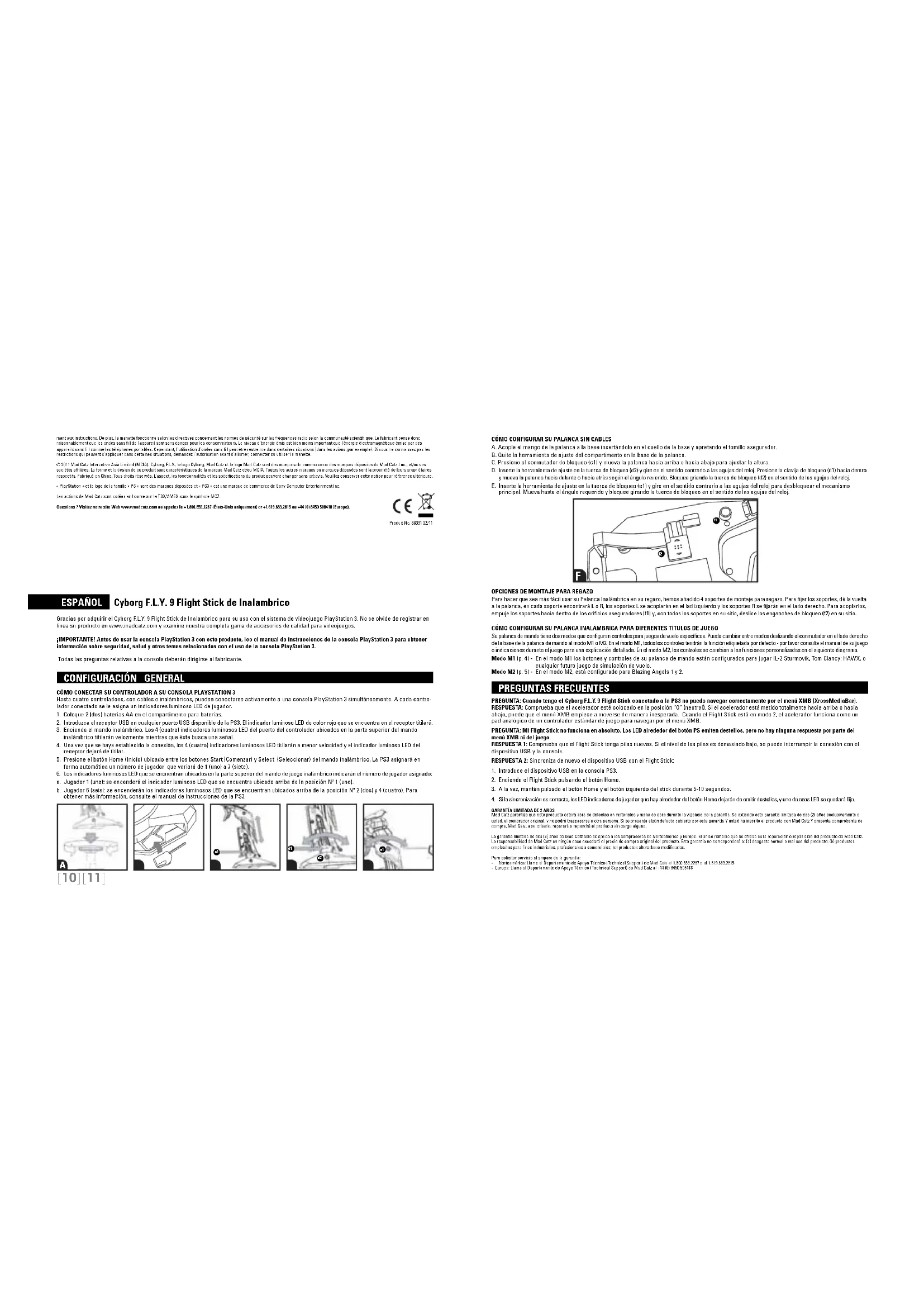 f2[12] [13] - Obtenga del Departamento de Apoyo Técnico un Número de Autorización para Devolución (Return Authorization Number)- Envíe el producto a Mad Catz porte pagado- Adjunte copia del comprobante de compra original en el que figura la fecha de compra - Adjunte la dirección completa a la cual debamos enviarle el producto, así como los números telefónicos donde podremos comunicarnos con uste durante el día y primeras horas de la noche. APOYO TÉCNICO Apoyo en línea y guías para el usuario: www.madcatz.comCorreo electrónico Norteamérica: techsupport@madcatz.com Teléfono Norteamérica: Desde las 8 hasta las 16 horas, hora del Pacífico, de lunes a viernes (con excepción de los días festivos en EE.UU.), 1.800.659.2287 (sólo desde EE.UU.) o 1.619.683.2815 (desde otros países).Correo electrónico Europa: techsupporteurope@madcatz.com Teléfono Europa: Desde las 9 hasta las 17 horas, hora del GMT, de lunes a viernes (con excepción de los días festivos), +44 (0) 8450 508418 PRECAUCIONES s 5SEESTEEQUIPOÞNICAMENTEDELMODOPREVISTO s 0ARAEVITARRIESGODEINCENDIOODEDESCARGAELÏCTRICANOEXPONGAESTEEQUIPOALALLUVIANIALAHUMEDAD.OLOUTILICEAMENOSDEMETROSDEDEPØSITOSDEAGUACOMOPISCINASBA×ERASOFREGADEROS s 0ARAEVITARDESCARGARELÏCTRICASNODESMONTEELEQUIPO%NCARGUELASREPARACIONESÞNICAMENTEATÏCNICOSCUALIlCADOS s .UNCAINTRODUZCAENELPRODUCTOOBJETOSDENINGÞNTIPODISTINTOSDELOSELEMENTOSAUTORIZADOSYAQUEPUEDENENTRARENCONTACTOCONPUNTOSDETENSIØNPELIGROSAOCORTOCIRCUITARPIEZASQUE podrían provocar incendios o descargas eléctricas. s $EJEINMEDIATAMENTEDEUTILIZARESTEEQUIPOSIEMPIEZAASENTIRCANSANCIOOSIEXPERIMENTAINCOMODIDADODOLORENLASMANOSYOBRAZOSMIENTRASUTILIZAELEQUIPO3IPERSISTIESENLOSSÓNTOMAS citados, consulte a un médico. s .OINTENTEUTILIZARLAUNIDADDENINGÞNMODOSALVOCONLASMANOS%VITESITUARELEQUIPOENCONTACTOCONLACABEZAOLACARAOPRØXIMOALOSHUESOSDECUALQUIEROTRAPARTEDELCUERPO s %VITEUSARESTEEQUIPODURANTELARGOSESPACIOSDETIEMPO(AGAPAUSASCADAMINUTOS s %LMALTRATODELASBATERÓASINCLUIDASENESTEEQUIPOPUEDEHACERQUEDICHASBATERÓASEXPERIMENTENFUGASYOEXPLOTENYPROVOQUENLESIONES s %STEPRODUCTOCONTIENELASPIEZASPEQUE×ASQUEPUEDENCAUSARESTRANGULARSIESTÉNTRAGADAS.OPREVISTOPARAELUSOPORLOSNI×OSBAJOA×OSDELAEDAD ALERTA s ,ASPILASNORECARGABLESNODEBENRECARGARSEs .OMEZCLEPILASVIEJASYNUEVASODETIPOSDIFERENTESs ,ASPILASDEBENINSERTARSECONLAPOLARIDADCORRECTAs 2ETIRELASPILASGASTADASDELPRODUCTOs .OREALICECORTOCIRCUITOSENTERMINALESDEALIMENTACIØNs ,ASPILASRECARGABLESDEBENEXTRAERSEDELPRODUCTOANTESDELACARGAs ,ASPILASRECARGABLESSOLODEBENCARGARSEBAJOLASUPERVISIØNDEUNADULTOs $EBECONSERVARSEELEMBALAJEDADOQUECONTIENEINFORMACIØNIMPORTANTEEPILEPSIA Algunas personas pueden tener ataques epilépticos o desmayos provocados por los destellos de la televisión, aunque nunca antes hayan tenido ninguno. Cualquier persona que haya sufrido epilepsia, pérdida de conocimiento u otro síntoma similar, deberá consultar a un médico antes de jugar con videojuegos. Los padres deberían estar alerta cuando sus hijos juegan con videojuegos y vigilarlos regularmente. Deje de jugar y consulte a un doctor si usted o su hijos tienen alguno de los siguientes síntomas:ConvulsionesPérdida del ConocimientoMovimientos InvoluntariosTics Oculares o MuscularesVisión AlteradaDesorientaciónCUANDO JUEGE CON VIDEOJUEGOS:1. Sitúese tan lejos de la pantalla como sea posible.2. Juege en la pantalla más pequeña disponible.3. No juegue si está cansado o necesita descansar.4. Juegue en una habitación bien iluminada.5. Tome un descanso de 15-minutos cada hora.LESIONES POR MOVIMIENTOS REPETITIVOS Jugar con videojuegos (y los movimientos repetitivos que ello implica) puede dañar sus músculos, articulaciones o la piel. Jugar con videojuegos de forma moderada evita tal daño. También: s 4OMEUNDESCANSODEMINUTOSCADAHORAAUNQUENOCREAQUELONECESITA s 3ISUSMANOSMU×ECASOBRAZOSEMPIEZANADOLERLEOSIENTEMOLESTIASOSESIENTECANSADODEJEDEJUGARYDESCANSEDURANTEALGUNASHORASANTESDEVOLVERAJUGAR s 3IELDOLORYLASMOLESTIASPERSISTENDEJEDEJUGARYCONSULTEAUNDOCTORDECLARACIÓN DE CONFORMIDAD DE LA UE: Número de Modelo: 88391Nombre Comercial: Cyborg F.L.Y. 9 Flight Stick de Inalambrico 3EGÞNLOEXIGIDOCIERTOSPRODUCTOSDEÏSTOSHANSIDOPROBADOSYESTÉNDECONFORMIDADCONLOSREQUERIMIENTOSDELASDIRECTIVASDELA5NIØN%UROPEA%#%#%#Y%#%L signatario autorizado del fabricante es Mad Catz, Inc., 7480 Mission Valley Road, Suite 101, San Diego, CA 92108.PRECAUCIÓNRIESGO DE EXPLOSIÓN SI LA BATERÍA SE SUSTITUYE POR UN MODELO INCORRECTO. DESHÁGASE DE LAS BATERÍAS USADAS DE ACUERDO CON LAS INSTRUCCIONES.Estados Unidos y Canadá: De acuerdo con las disposiciones legales, algunos de estos dispositivos digitales de clase B (los controladores) han sido probados por Mad Catz, Inc., 7480 Mission Valley Road, Suite 101, San Diego, CA 92108, y cumplen con la sección 15 de las normas FCC y con la norma canadiense RSS-210 que establece los límites para proporcionar protección razonable frente a interferencias negativas en instalaciones residenciales. Estos dispositivos usan, generan y pueden radiar energía de radio frecuencia y, si no se instalan y usan de acuerdo a las instrucciones, pueden causar interferencias perjudiciales para las comunicaciones de radio. No existe ninguna garantía de que no se produzcan interferencias en ningún lugar o con ningún uso en particular. El funcionamiento está sujeto a las dos condiciones siguientes: (1) este dispositivo no puede causar interferencias perjudiciales y (2) este dispositivo debe aceptar cualquier interferencia recibida, incluidas aquellas que pueda causar el funcionamiento no deseado.Exposición a la emisión de frecuencias de radio: La potencia de salida emitida por el mando se encuentra dentro de los límites de frecuencia de radio de la FCC para este tipo de dispositivo, si no se modifi ca y se utiliza tan y como se indica en las instrucciones y el mando se maneja según las indicaciones de los estándares de seguridad de frecuencia de radio, que refl ejan el acuerdo 