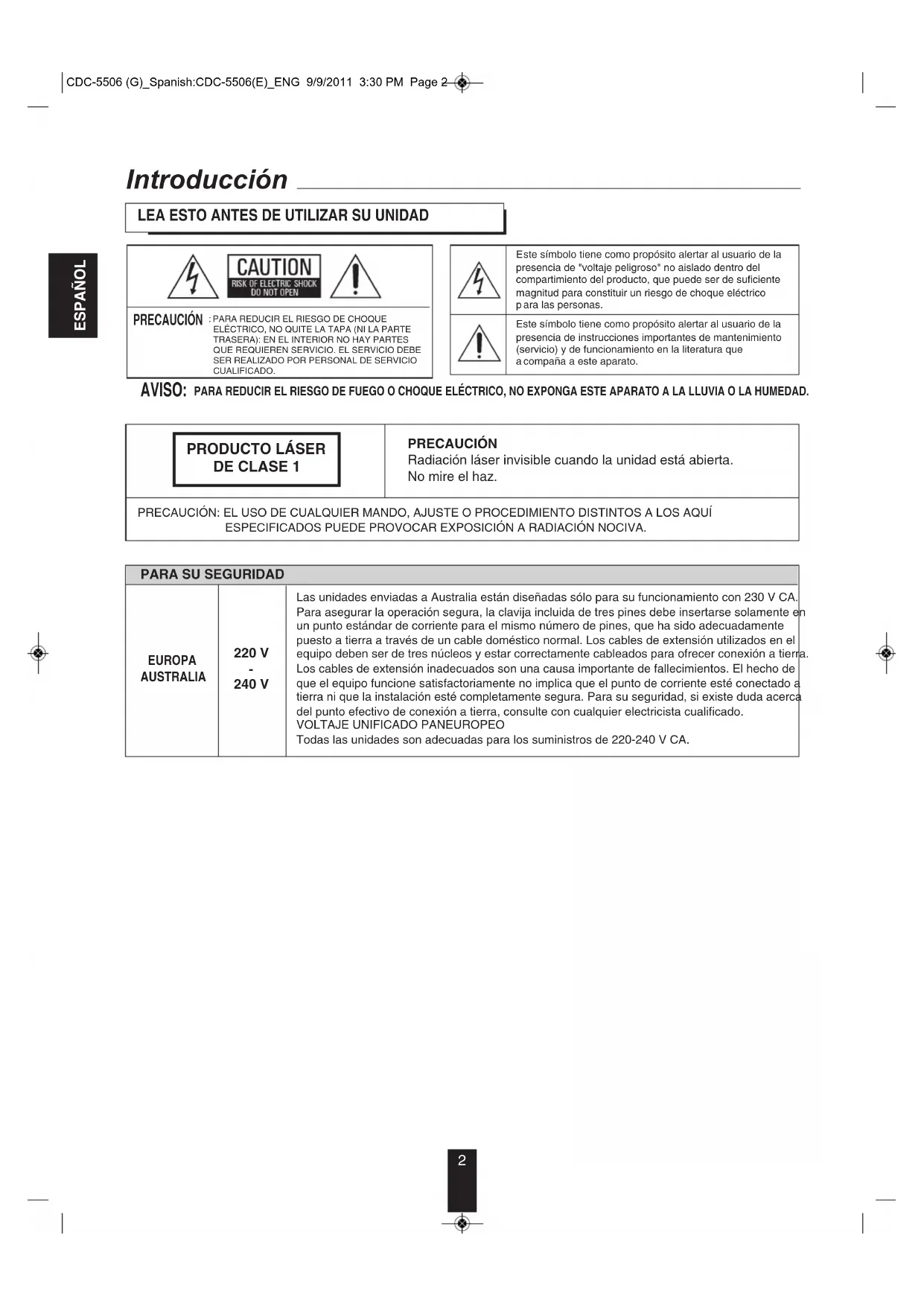 240 V LEA ESTO ANTES DE UTILIZAR SU UNIDAD PRECAUCIÓN Radiación láser invisible cuando la unidad está abierta. No mire el haz. PRECAUCIÓN: EL USO DE CUALQUIER MANDO, AJUSTE O PROCEDIMIENTO DISTINTOS A LOS AQUÍESPECIFICADOS PUEDE PROVOCAR EXPOSICIÓN A RADIACIÓN NOCIVA.