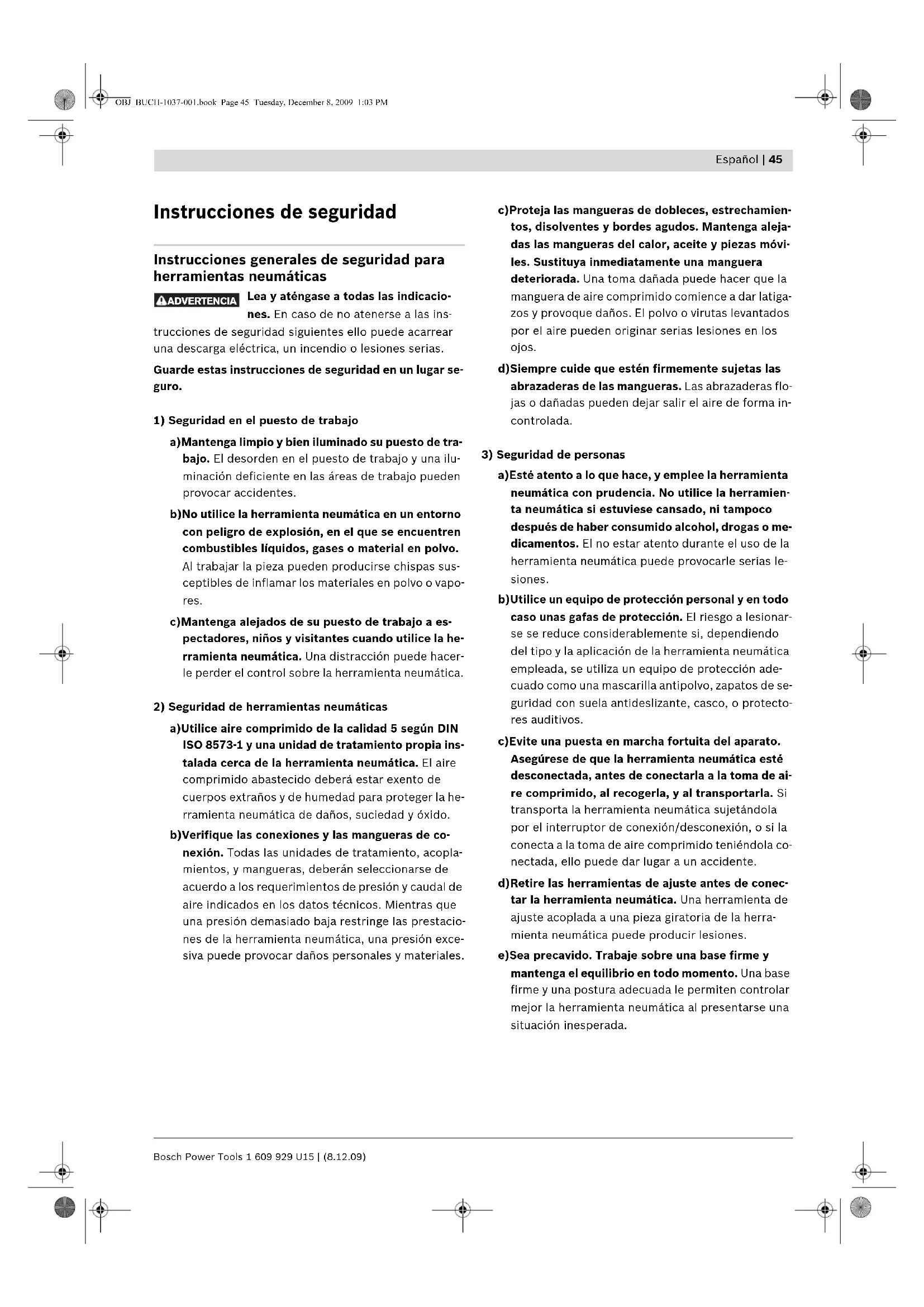 a)Esté atento a lo que hace, y emplee la herramienta neumática con prudencia. No utilice la herramien- ta neumática si estuviese cansado, ni tampoco después de haber consumido alcohol, drogas o me- dicamentos. El no estar atento durante el uso de la herramienta neumática puede provocarle serias le- siones. b)Utilice un equipo de protección personal y en todo caso unas gafas de protección. El riesgo a lesionar- se se reduce considerablemente si, dependiendo del tipo y la aplicación de la herramienta neumática empleada, se utiliza un equipo de protección ade- cuado como una mascarilla antipolvo, zapatos de se- guridad con suela antideslizante, casco, o protecto- res auditivos. c)Evite una puesta en marcha fortuita del aparato. Asegúrese de que la herramienta neumática esté desconectada, antes de conectarla a la toma de ai- re comprimido, al recogerla, y al transportarla. Si transporta la herramienta neumática sujetándola por el interruptor de conexión/desconexión, o si la conecta a la toma de aire comprimido teniéndola co- nectada, ello puede dar lugar a un accidente. d)Retire las herramientas de ajuste antes de conec- tar la herramienta neumática. Una herramienta de ajuste acoplada a una pieza giratoria de la herra- mienta neumática puede producir lesiones. e)Sea precavido. Trabaje sobre una base firme y mantenga el equilibrio en todo momento. Una base firme y una postura adecuada le permiten controlar mejor la herramienta neumática al presentarse una situación inesperada. ADVERTENCIA OBJ_BUCH-1037-001.book Page 45 Tuesday, December 8, 2009 1:03 PM1 609 929 U15 | (8.12.09) Bosch Power Tools 46 | Español f) Lleve puesta ropa de trabajo adecuada. No utilice ropa holgada ni joyas. Mantenga su pelo, vestimen- ta y guantes alejados de las piezas móviles. La ropa suelta, el pelo largo y las joyas se pueden enganchar con las piezas en movimiento. g)Siempre que sea posible utilizar unos equipos de aspiración o captación de polvo, asegúrese que és- tos estén montados y que sean utilizados correcta- mente. La utilización de estos equipos reduce los riesgos derivados del polvo. h)No aspire directamente el aire de salida. Evite que el aire de salida sea dirigido hacia sus ojos. El aire de salida de la herramienta neumática puede conte- ner agua, aceite, partículas metálicas o suciedad proveniente del compresor. Ello puede ser nocivo para la salud.